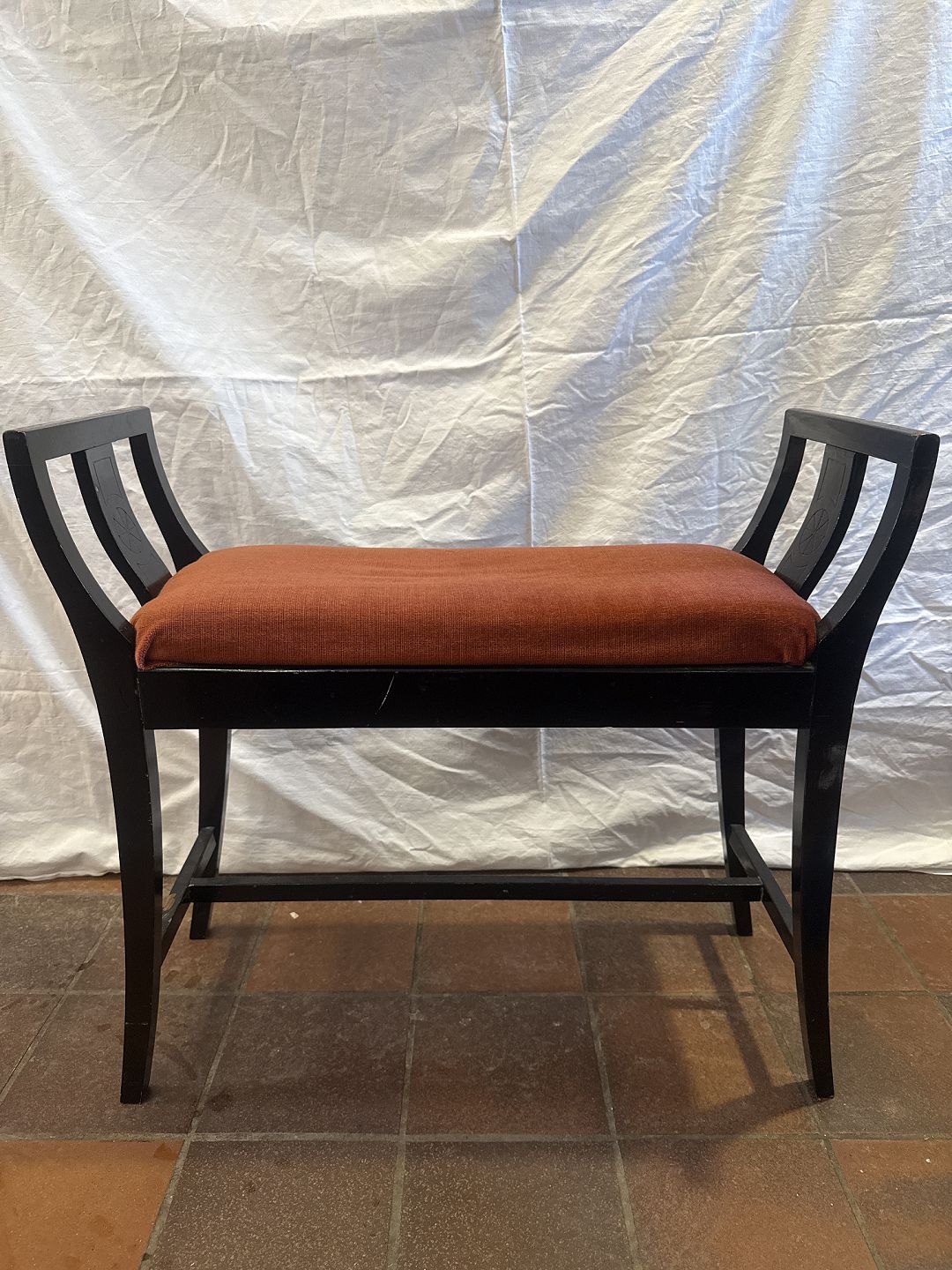 Beskrivelse: Klaverbænk i sortlakeret træ betrukket m. rødt velour stof.