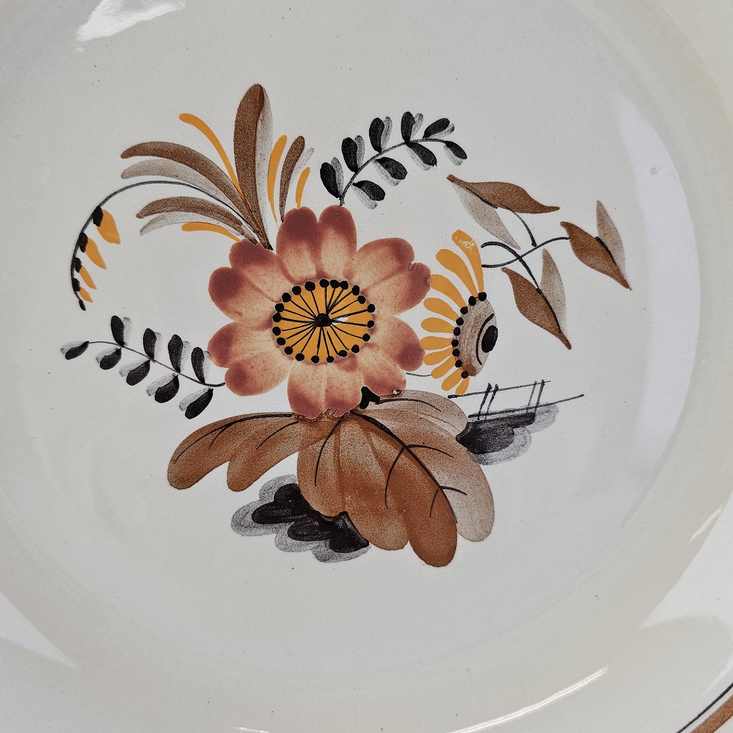 Knud er cremefarvet fajance dekoreret med flettet kant og brune og orange blomster. Stellet blev produceret i år 1934-1963.