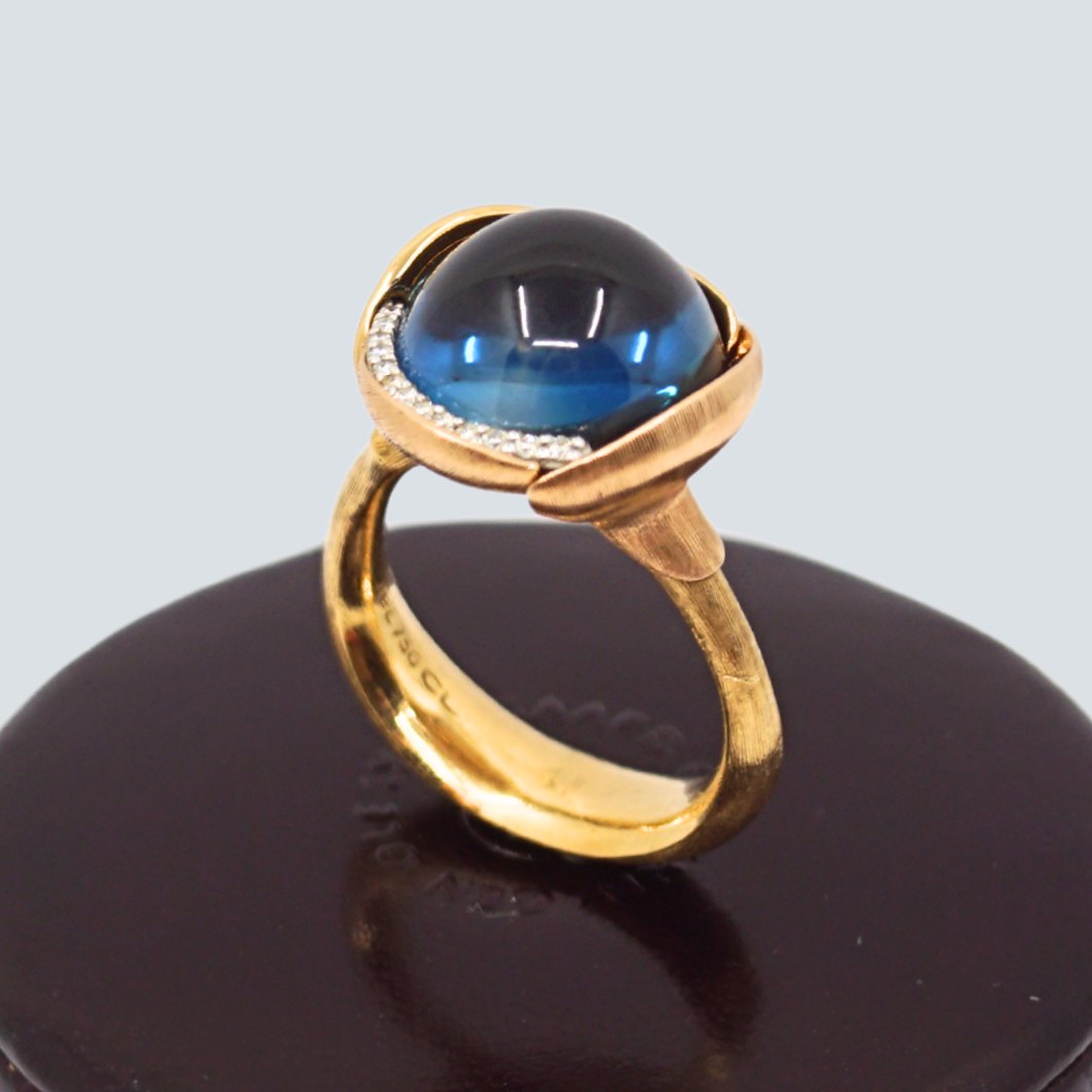 Charlotte Lynggaard for Ole Lynggaard; Lotus ring no. 3 in 18k gold, with blue topaz and 13 brilliant-cut diamonds. Two of the leaves in rose gold.
