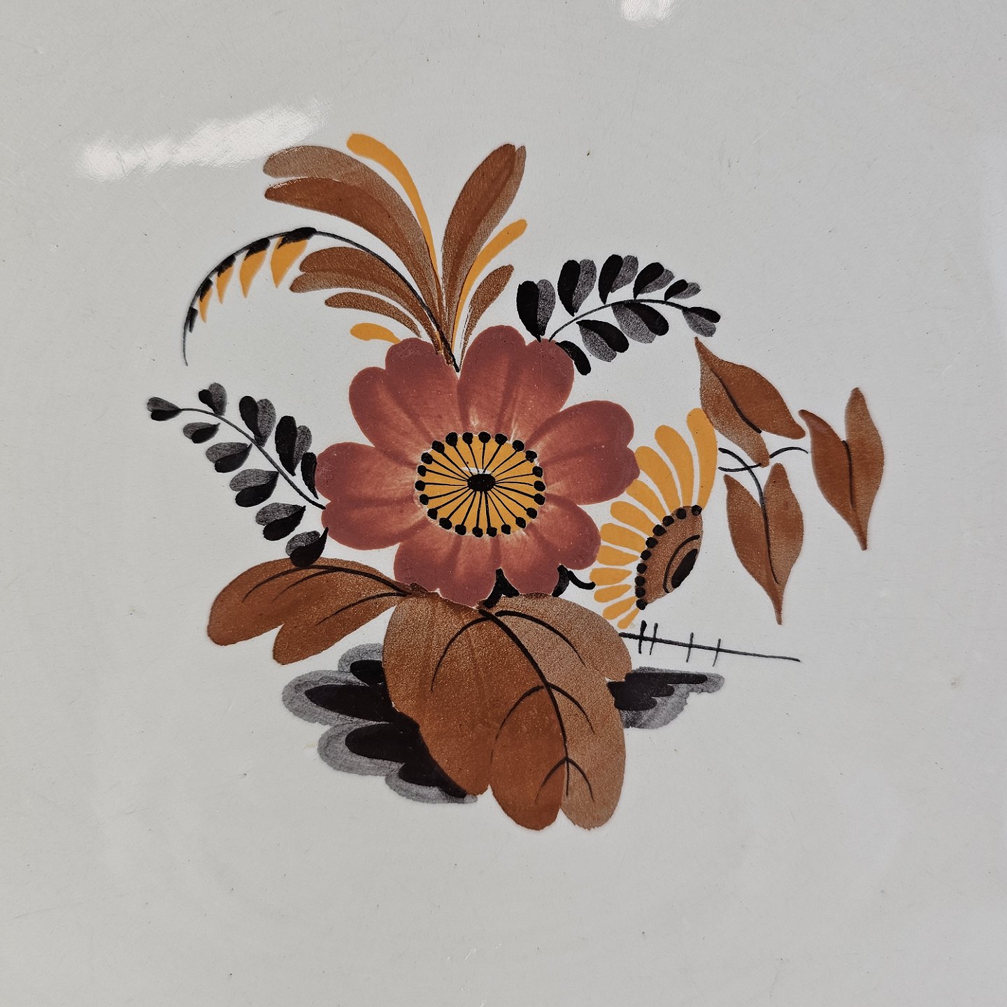 Beskrivelse: Rundt fad i fajance fra stellet Knud