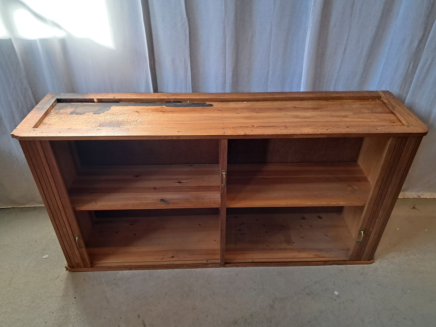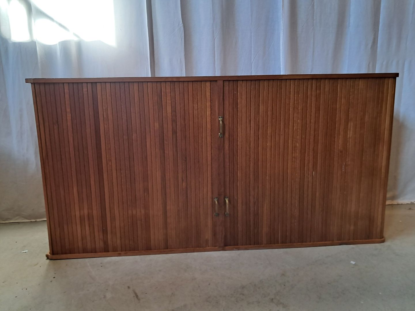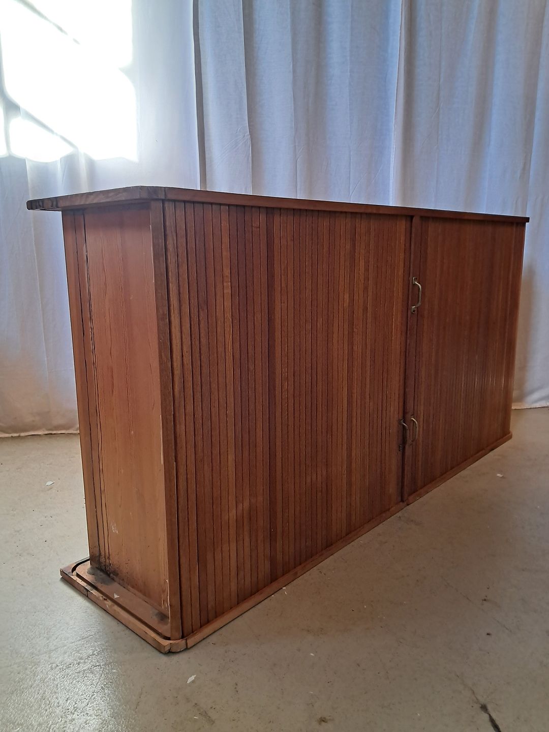 Beskrivelse: Jalousiskab i fineret egetræ, fra 1950erne.