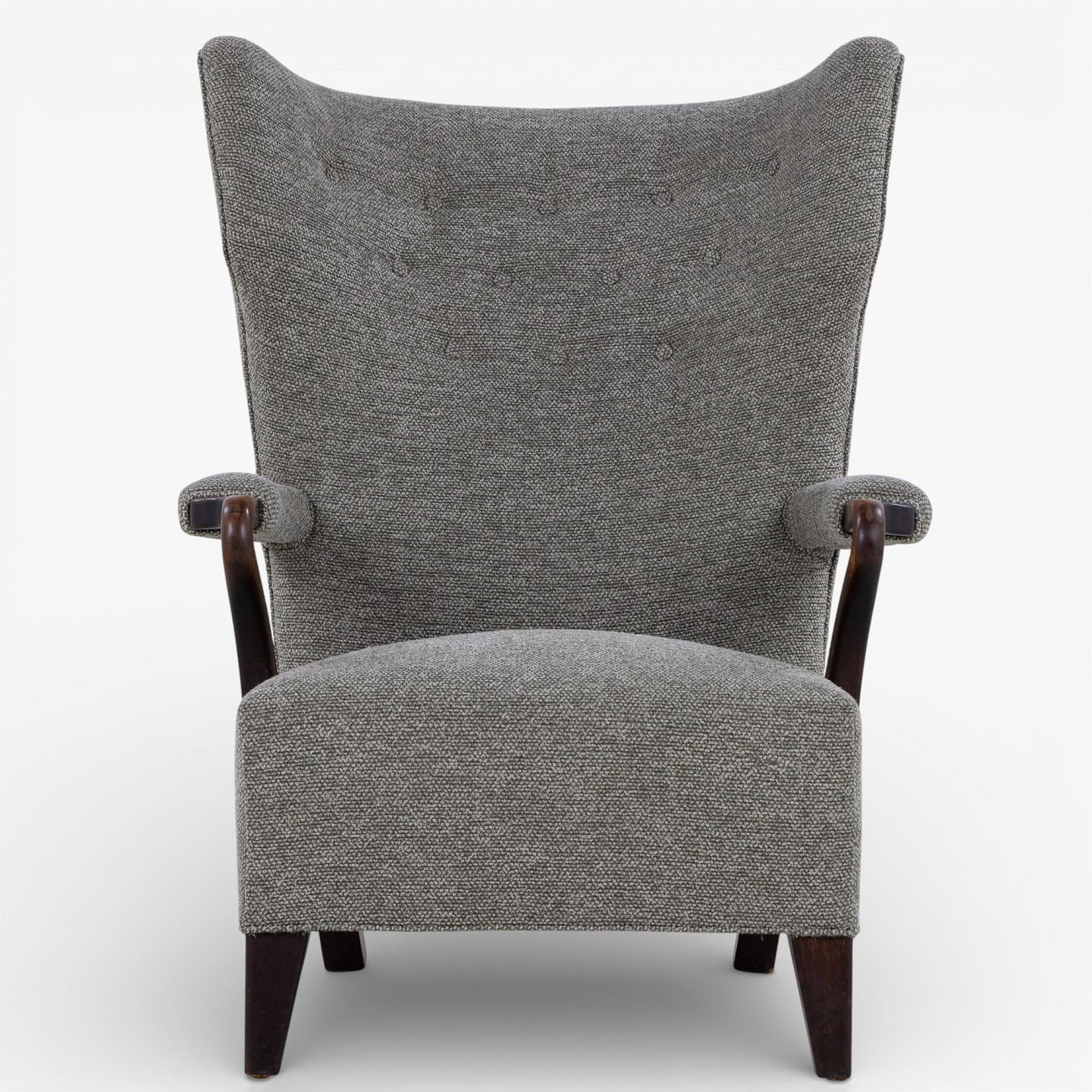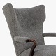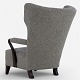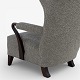 Højrygget lænestol betrukket med nyt 'Moss'-tekstil (farve: 0002) m. arme og ben i bejdset eg.