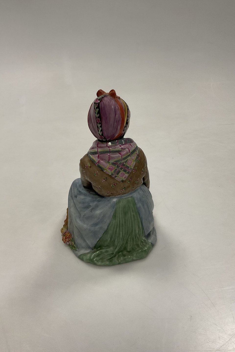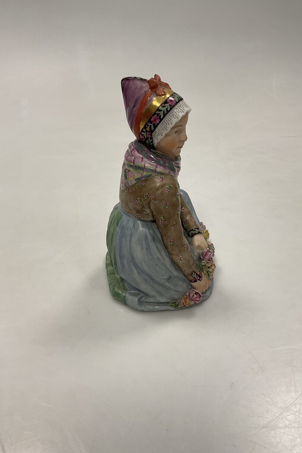 Beskrivelse: Royal Copenhagen Siddende Fanøpige af Carl Martin-Hansen No. 12413. Med Juliane Marie stempel. Måler 14,5 cm. 1. sortering, med små afslag på blomster - se billeder