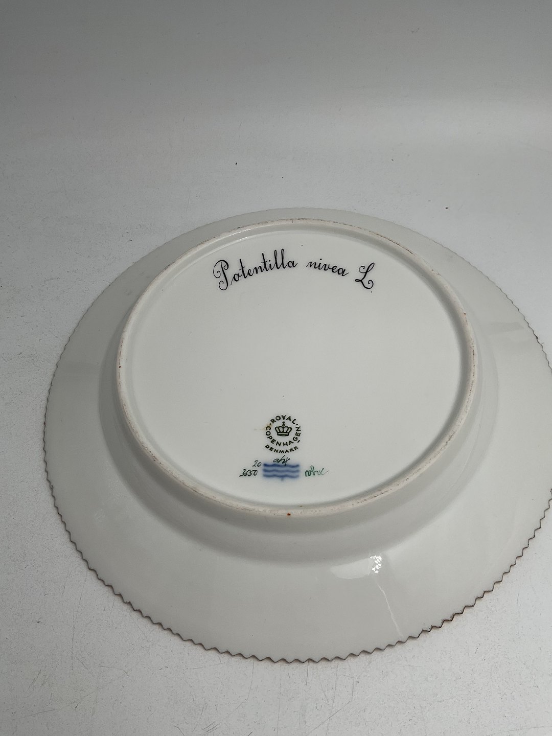 Beskrivelse: Royal Copenhagen Flora Danica Frokosttallerken No. 20/3550 Måler 22 cm. (8.66 inch) 1. Sortering. Latinsk navn: Potentilla nivea L