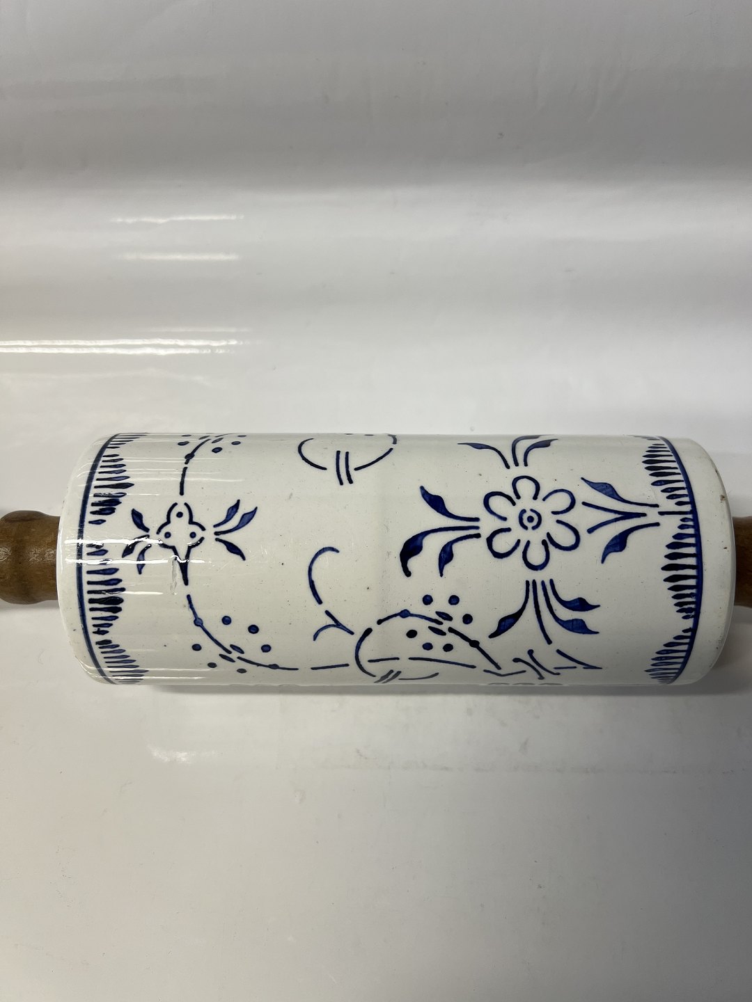 Description: Rolling pin Blue Fluted faience with wooden handle.
