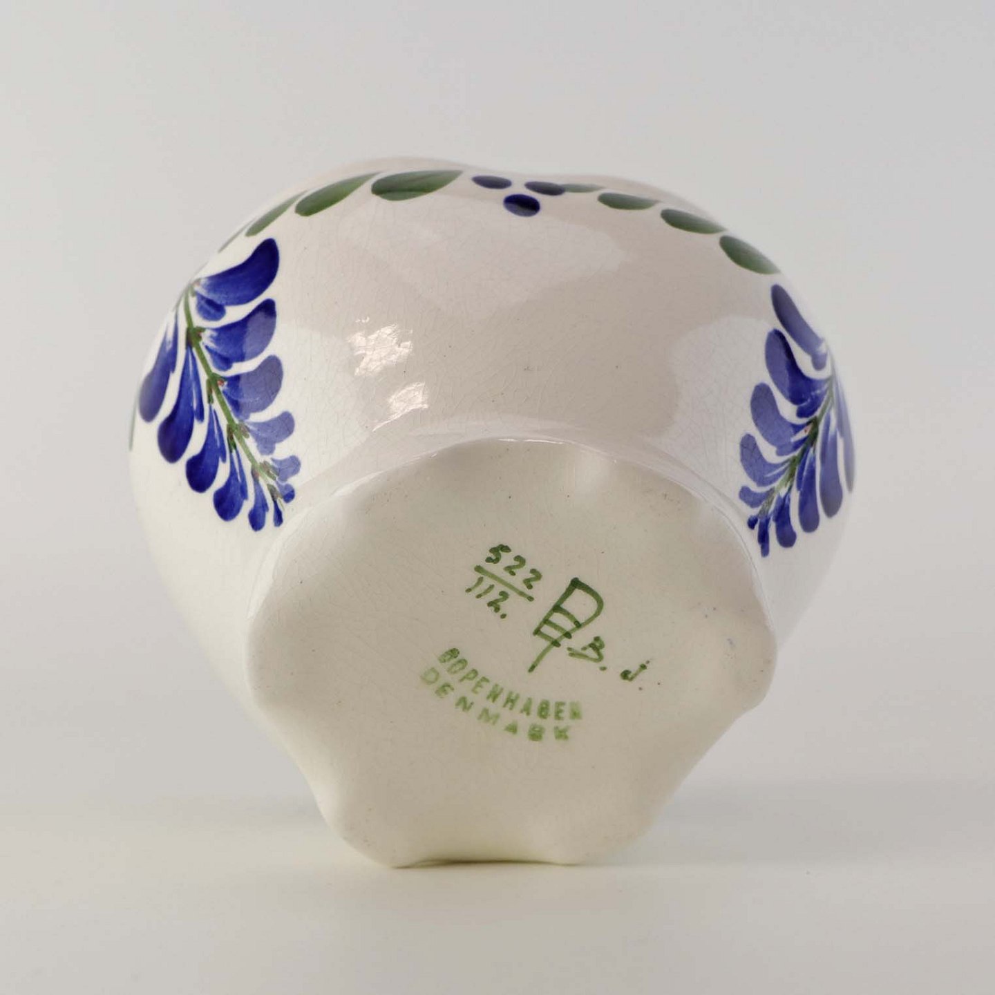 Beskrivelse: Lav trekantet vase i fajance fra stellet Blåregn. Stellet er fremstillet i perioden år 1903-1933. Nr. 522/112