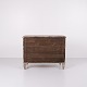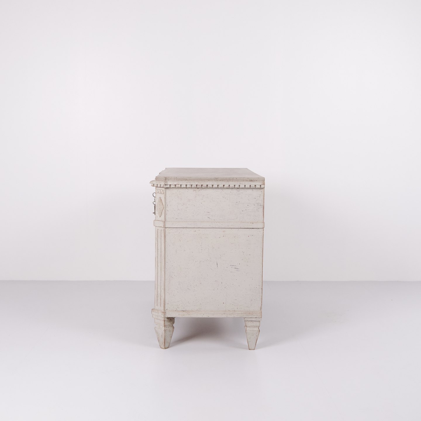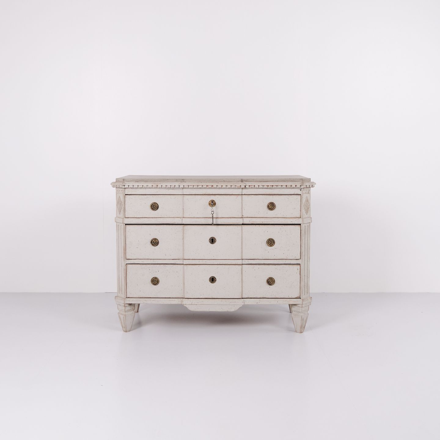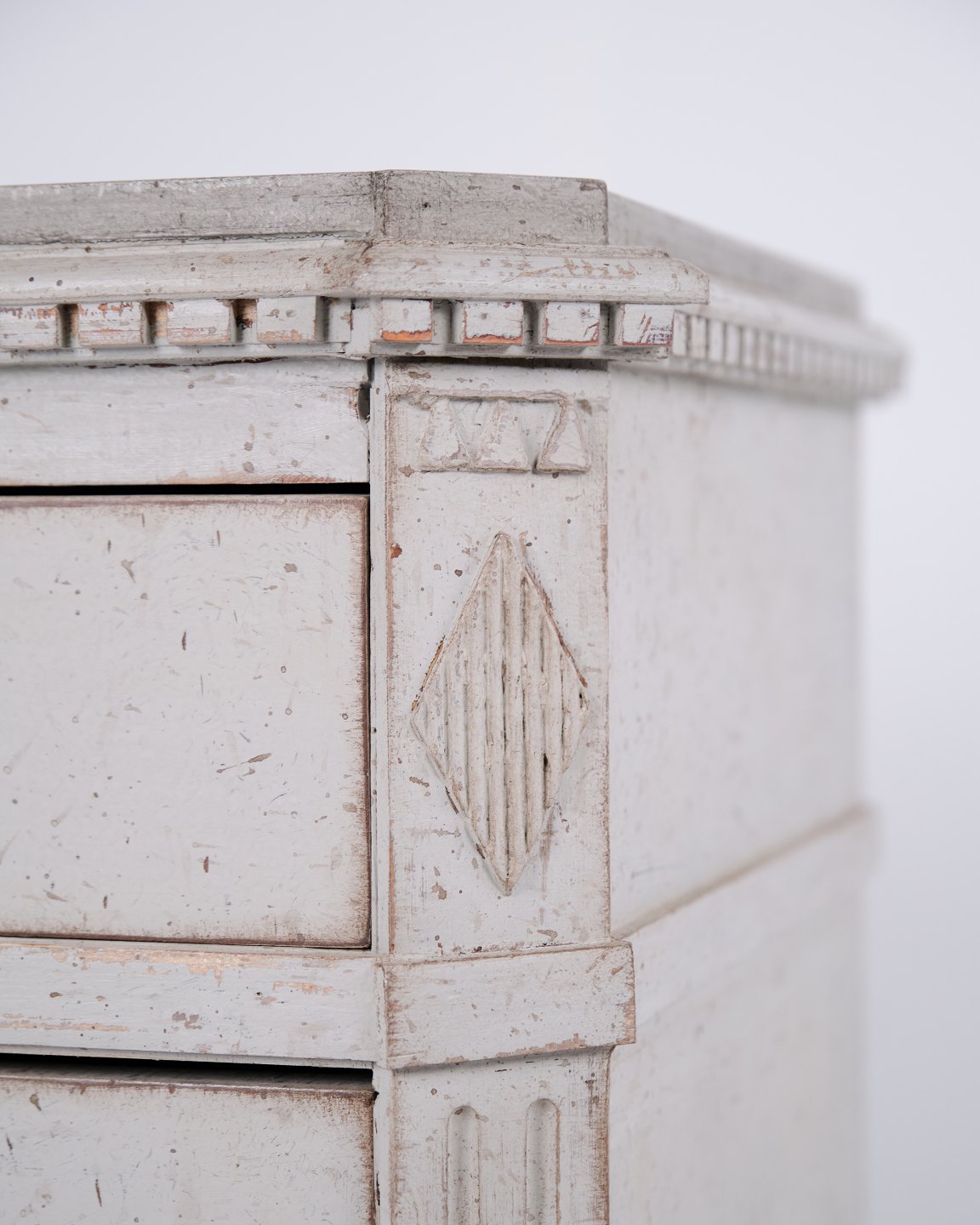 Under toppladen ses et fint træudskåret tandsnit, mens korpus rummer tre skuffer flankeret af skrå hjørner med kannelering og afsluttet øverst med en dekorativ træskåret rombe.