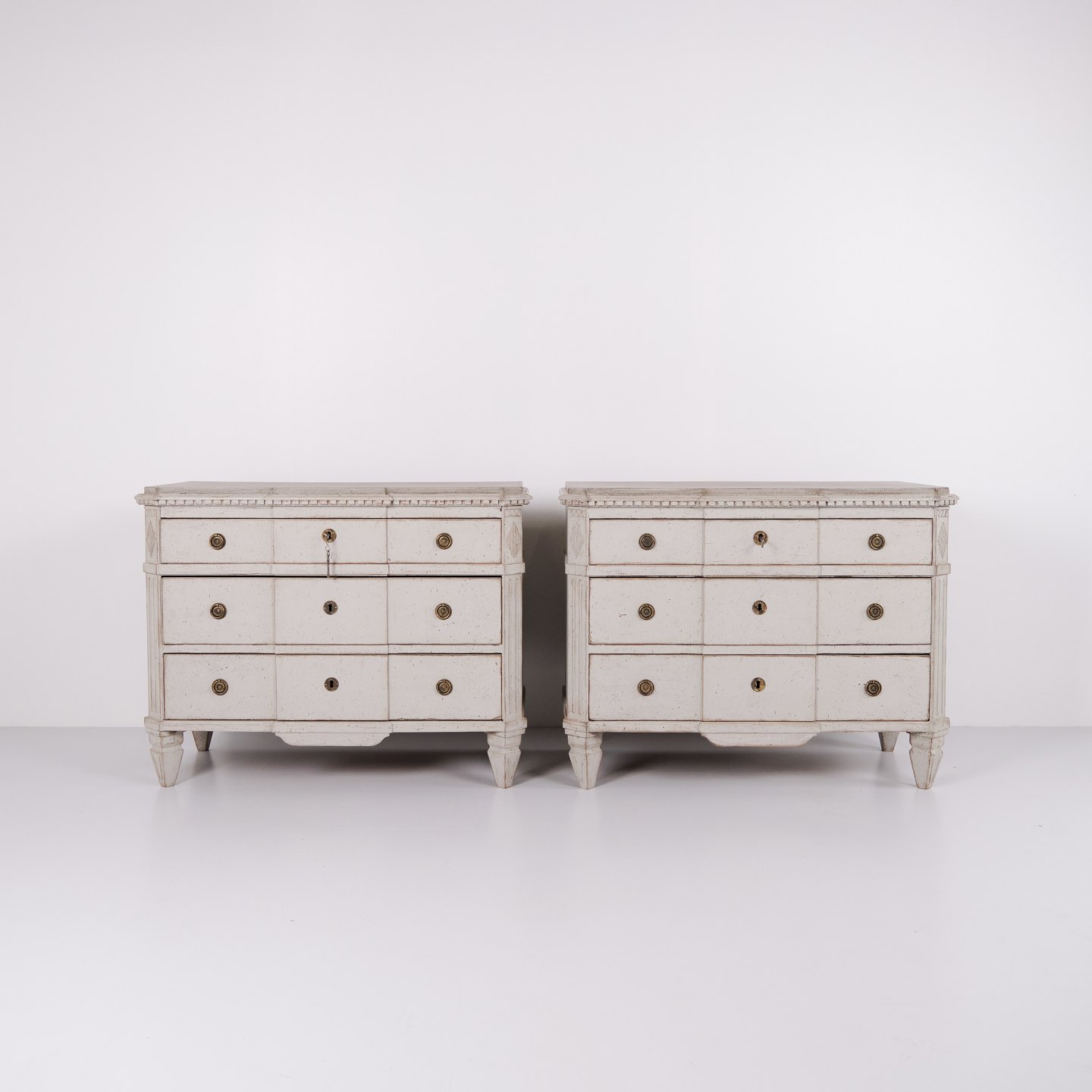 Beskrivelse: Par gustavianske kommoder fra Sverige ca. 1790 med gråhvid bemaling og patina.