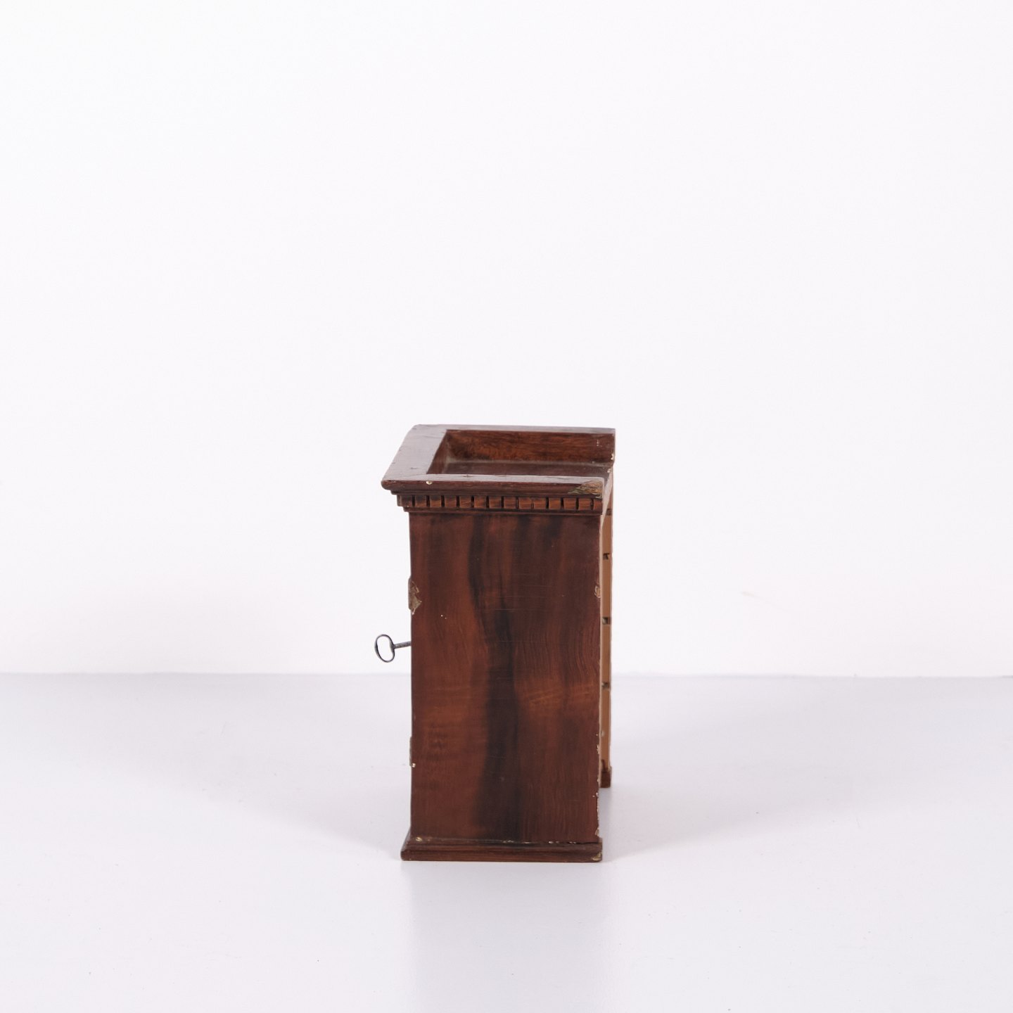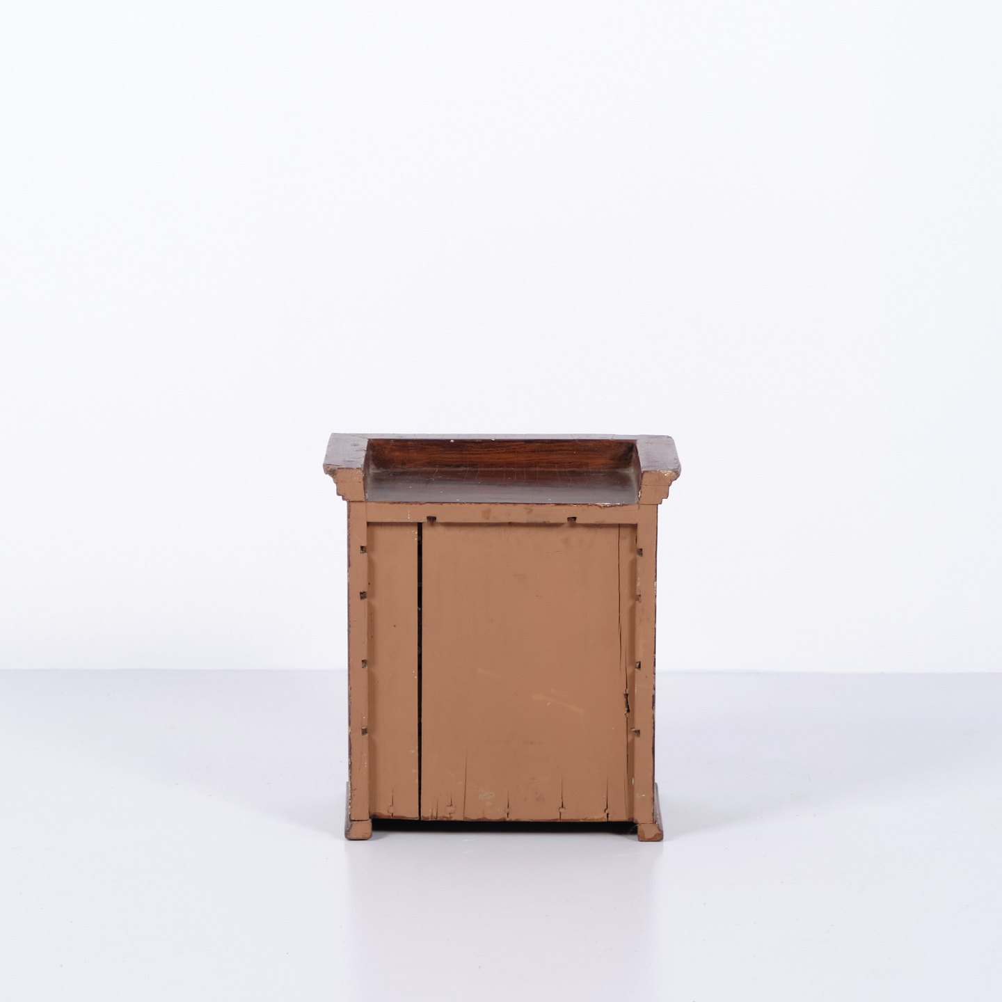 Beskrivelse: Antikt miniaturemøbel i egetræ med håndsmedede beslag fra 1840’erne. Unikt og dekorativt samlerobjekt med historisk karakter.