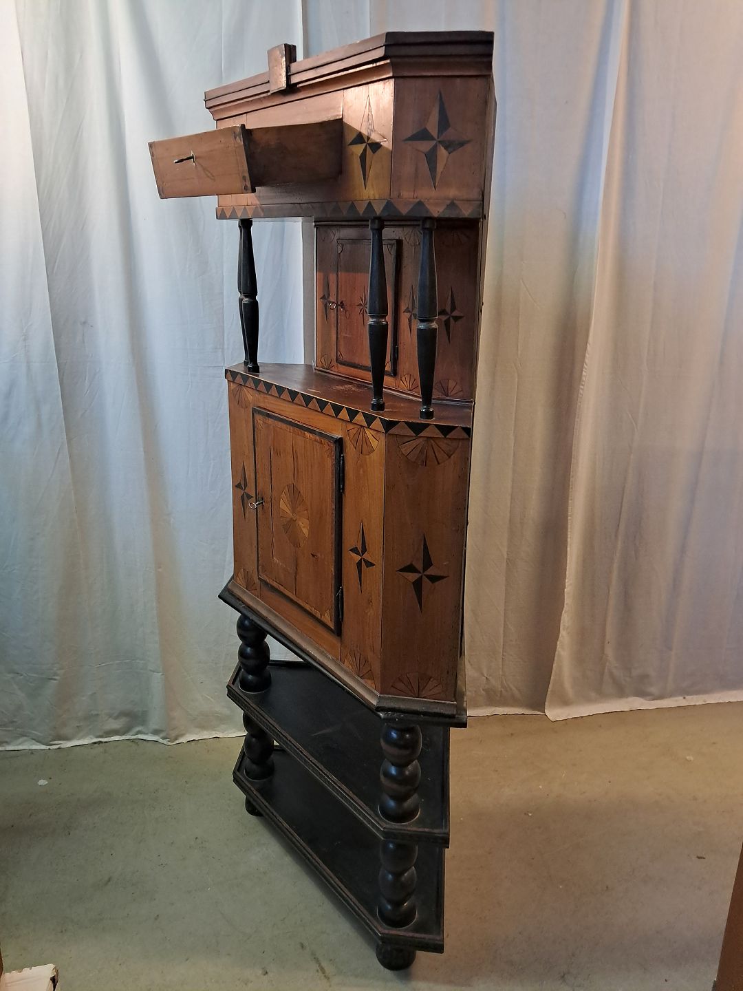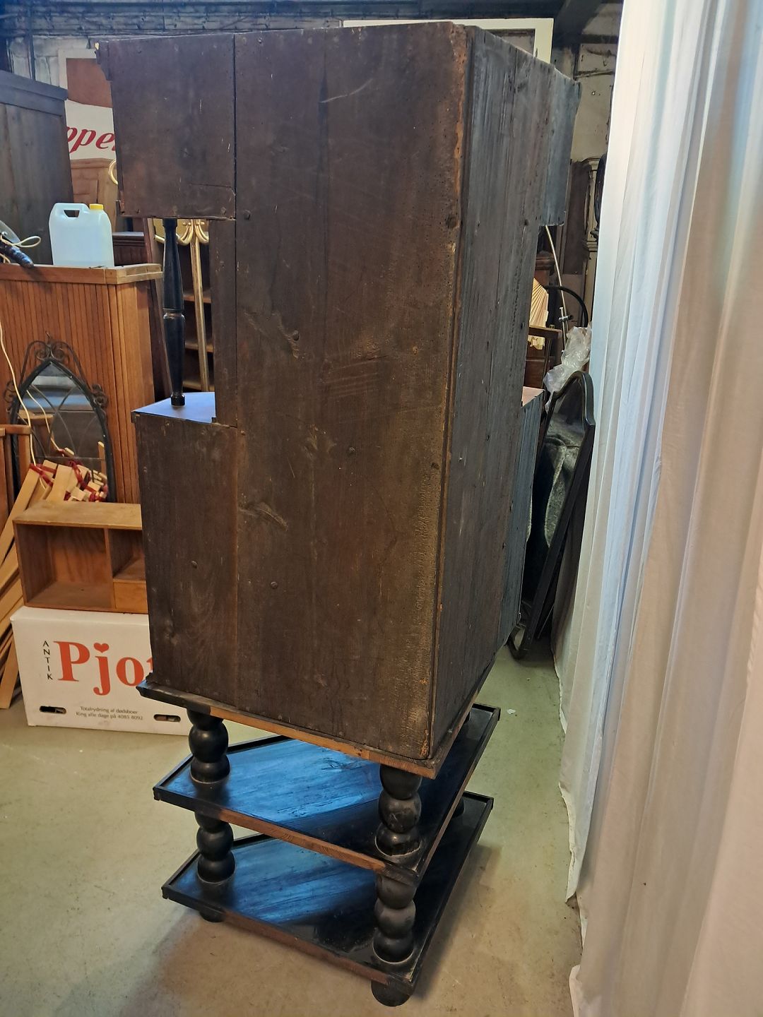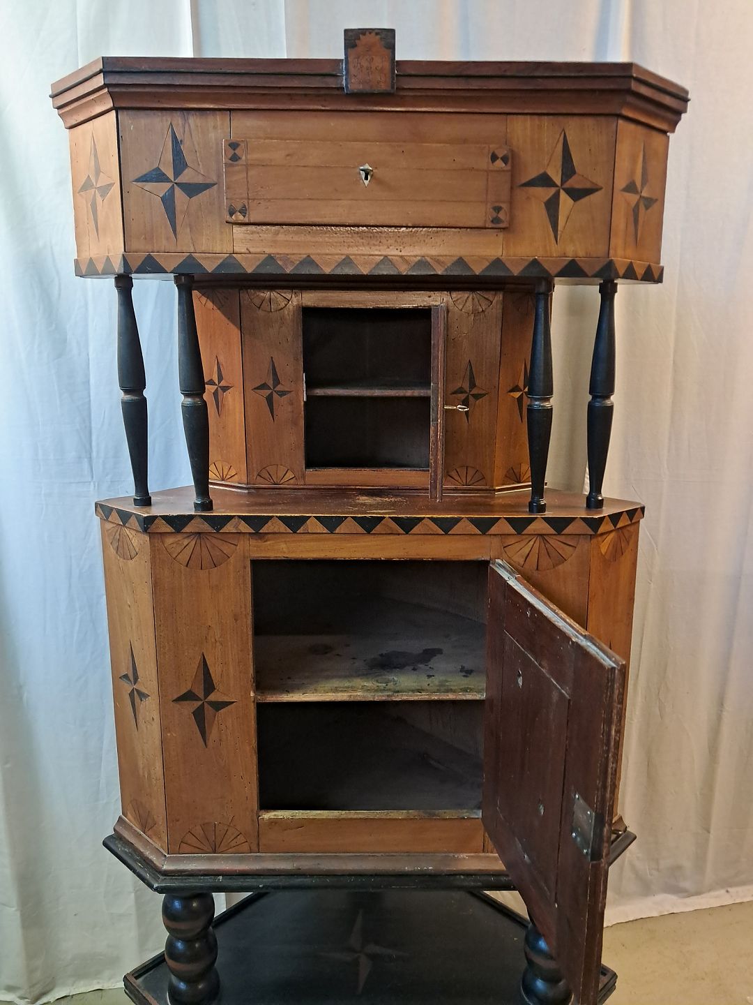 Beskrivelse: Hjørneskab i ege og elmetræ, det har 200 års jubilæum