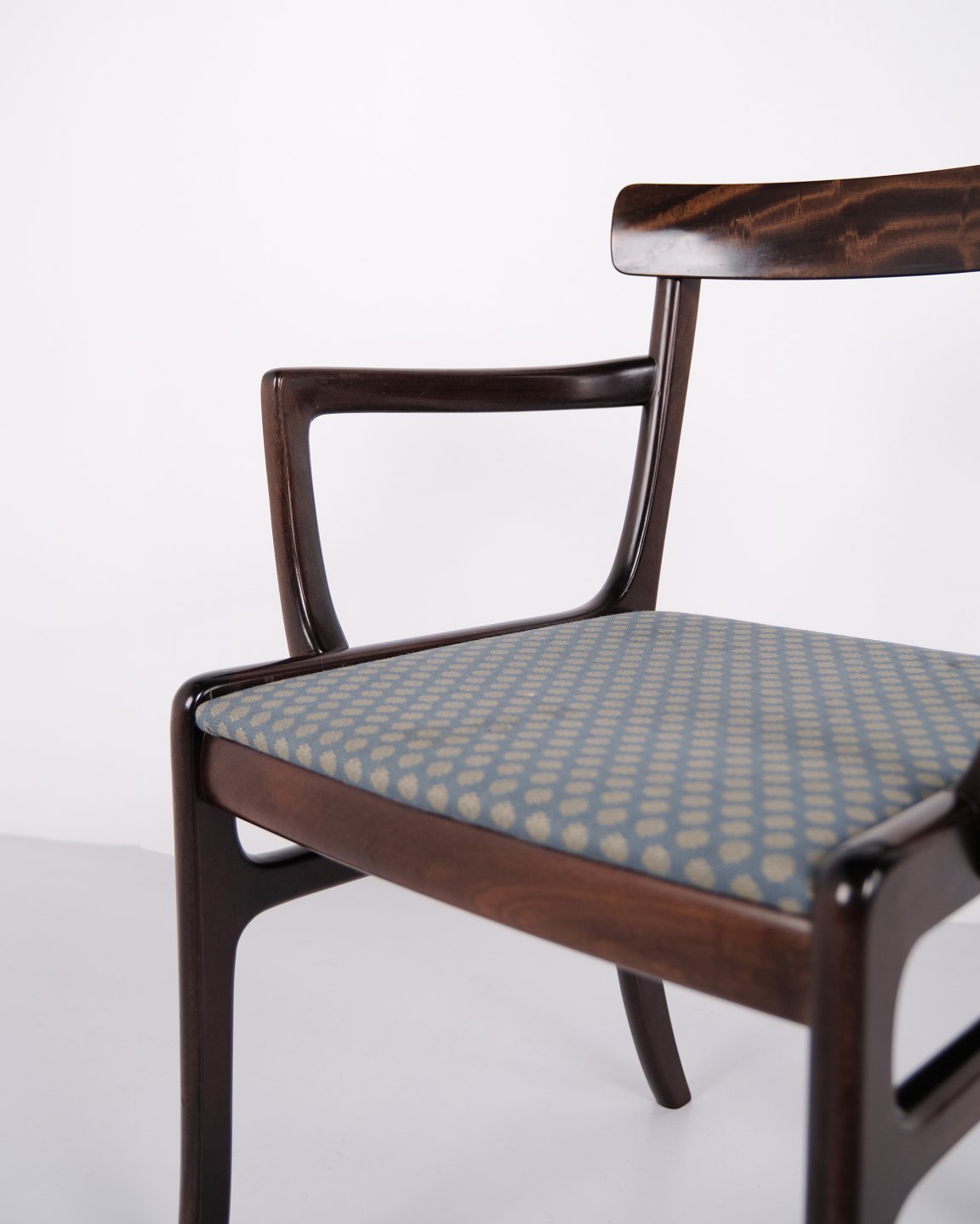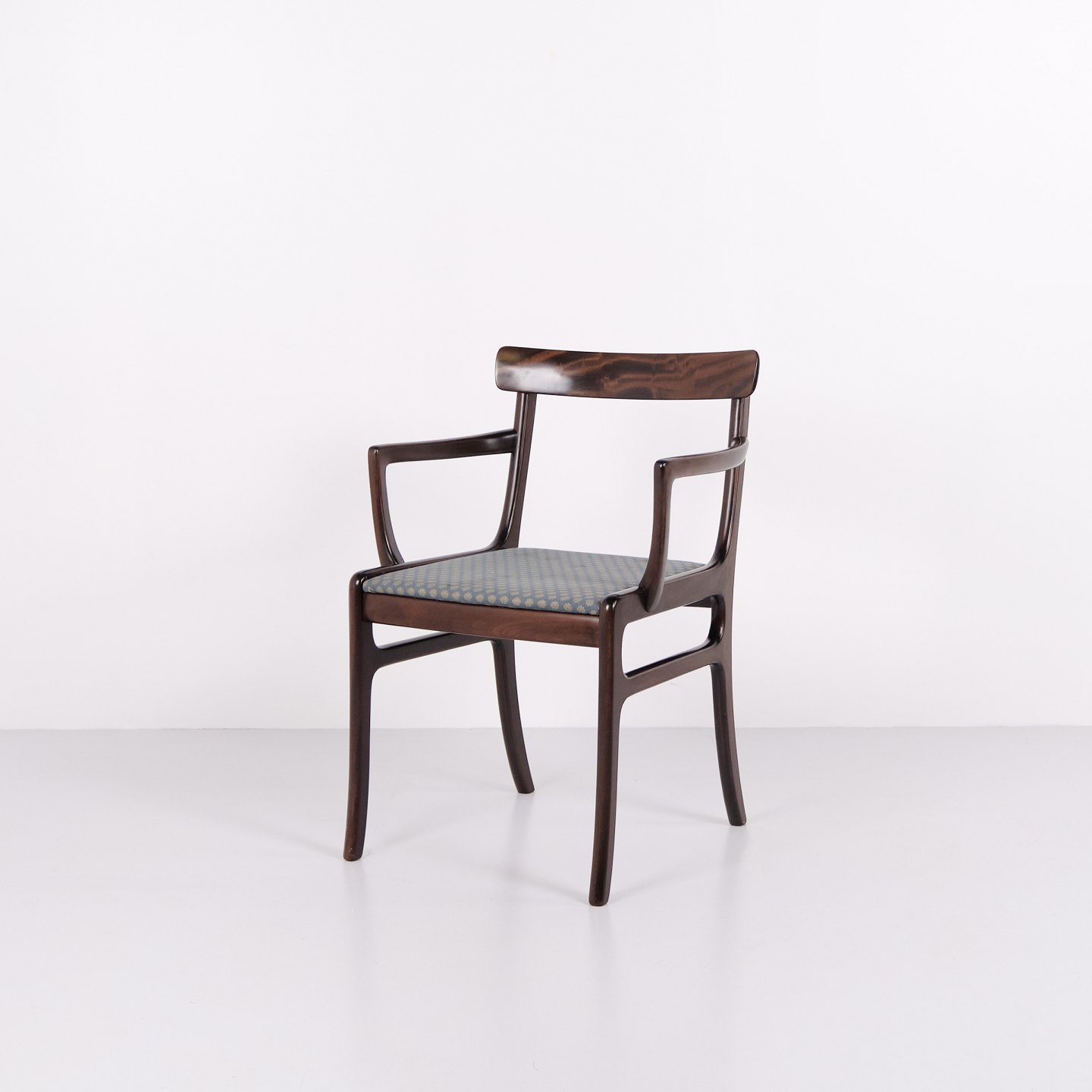 Beskrivelse: Armstol fra serien Rungstedlund formgivet af Ole Wanscher og produceret hos Poul Jeppesen Møbelfabrik i Danmark i 1950’erne. Stolen er udført i et klassisk og velafbalanceret formsprog, hvor proportioner og snedkerarbejde afspejler den danske designtradition fra midten af det 20. århundrede.