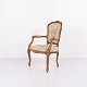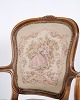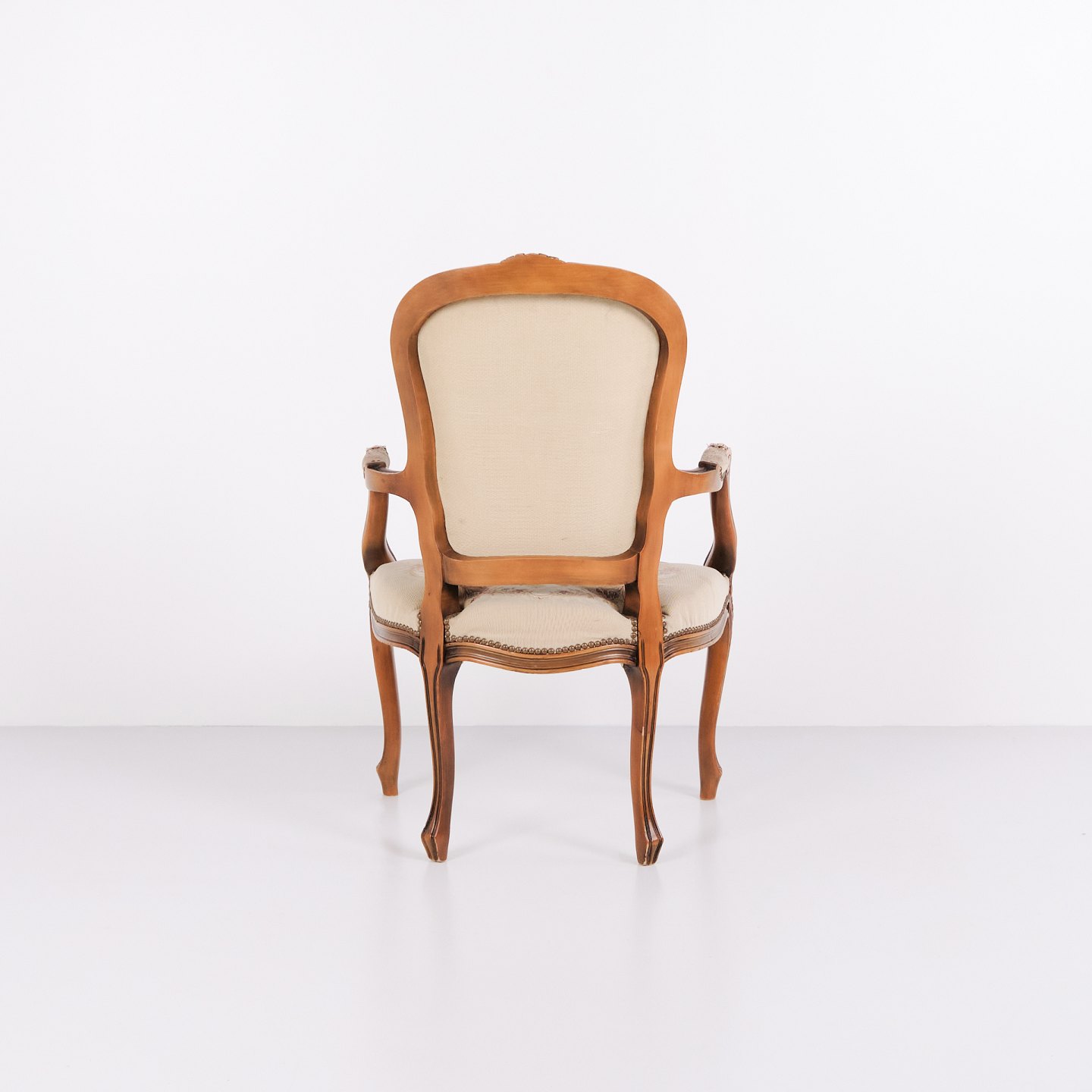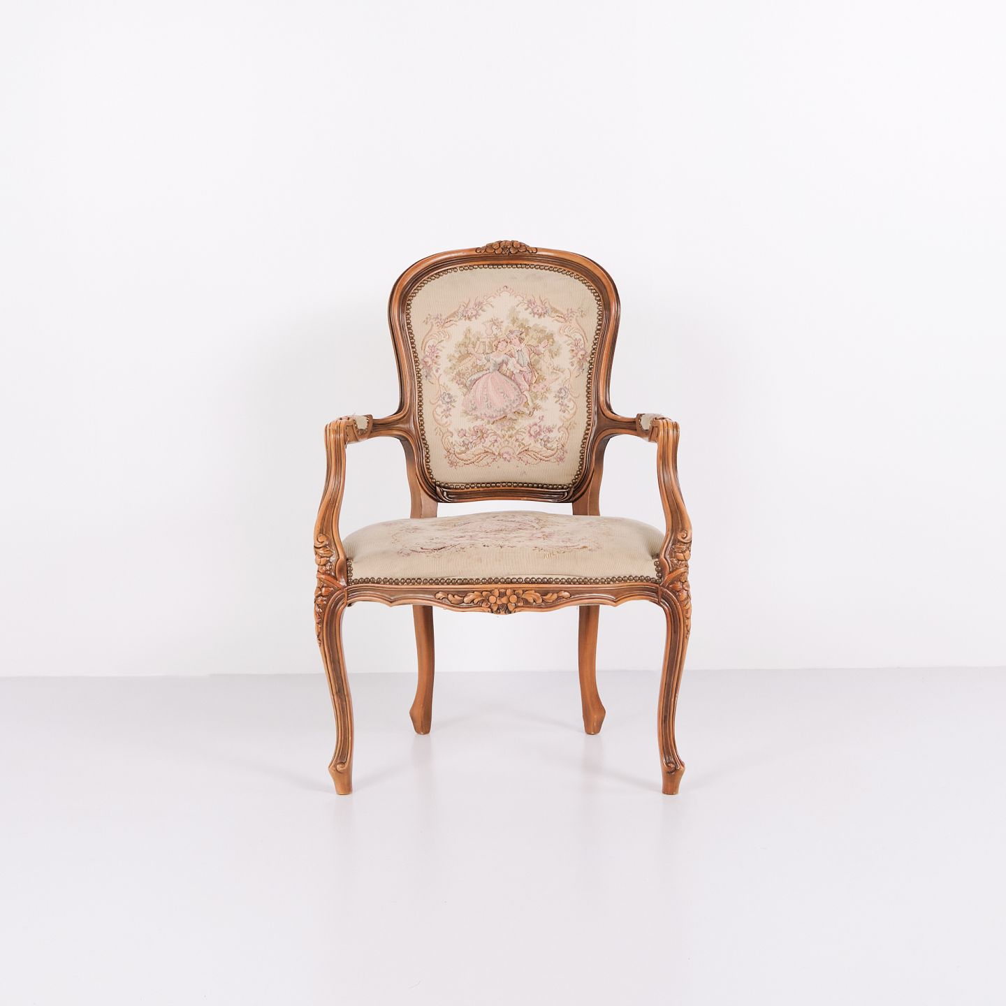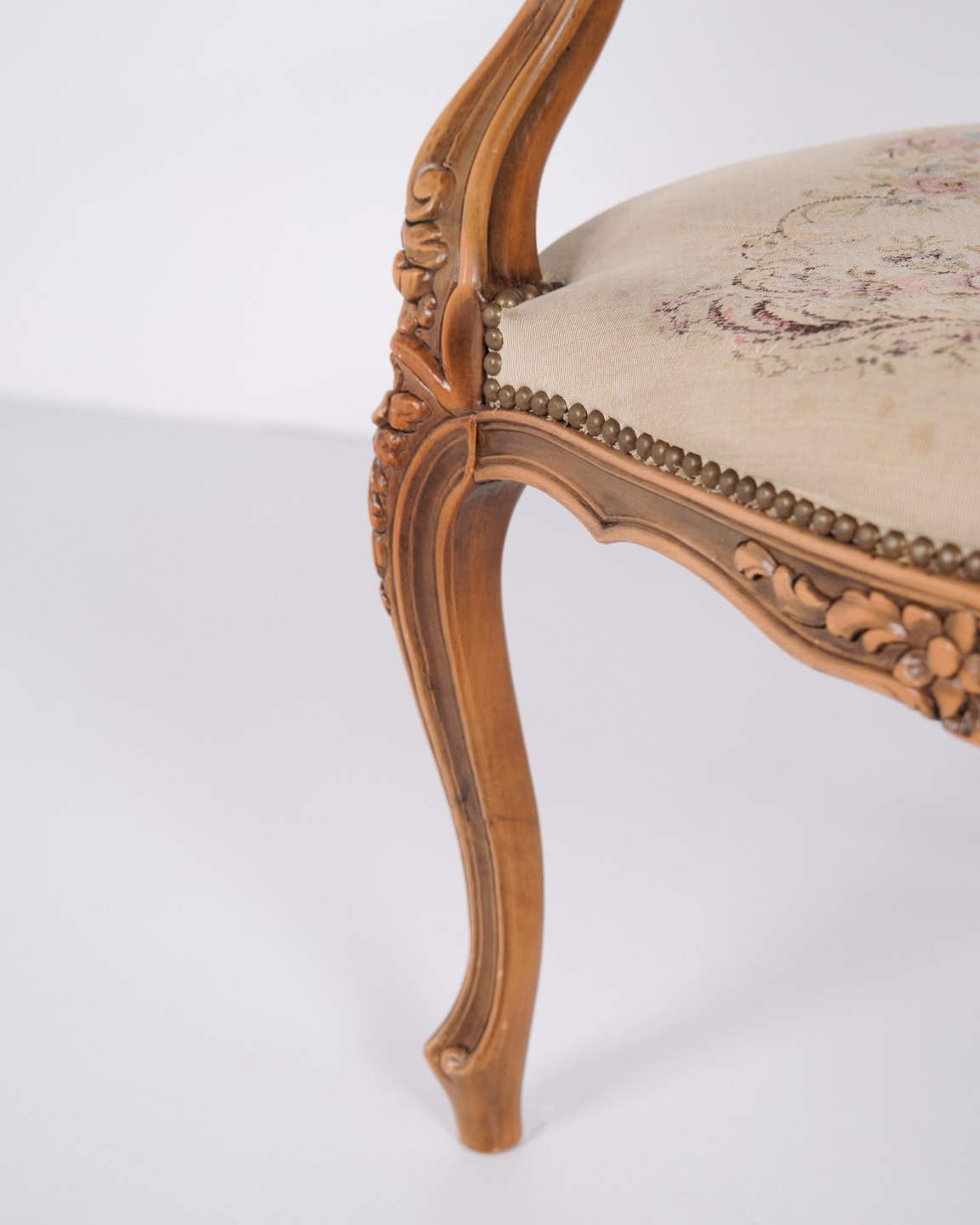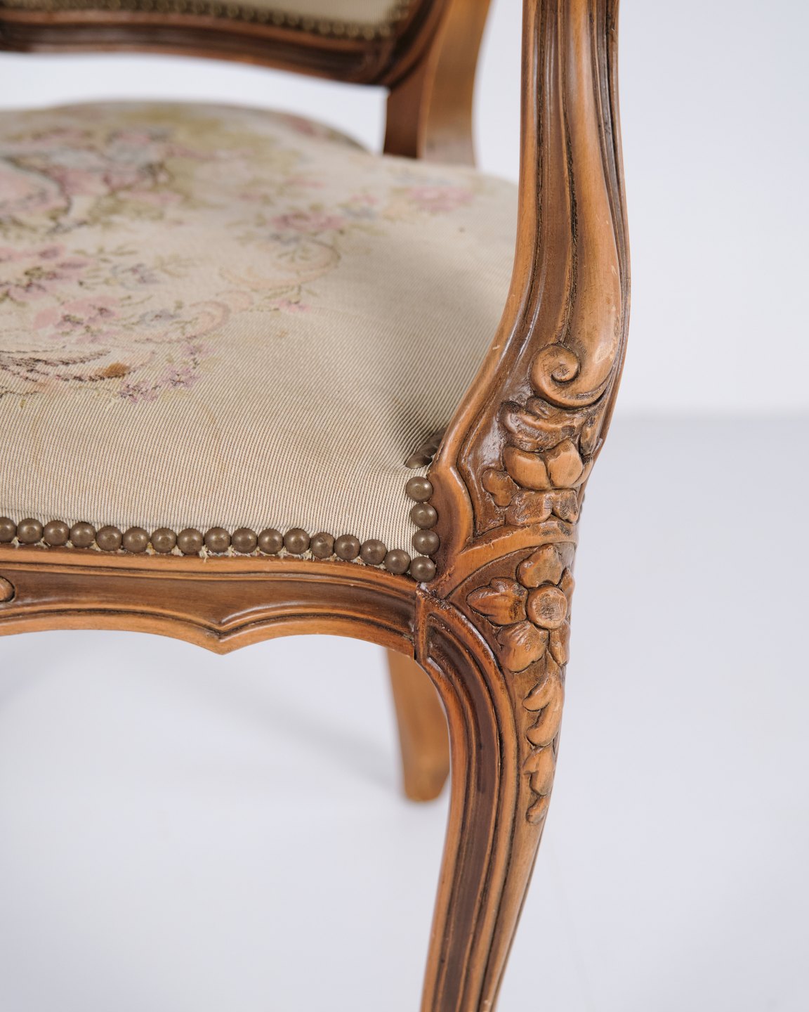 Beskrivelse: Nyrokoko armstol fra 1930’erne med buede ben og mønstret blomstret stof. Klassisk og dekorativt møbel i elegant stil.