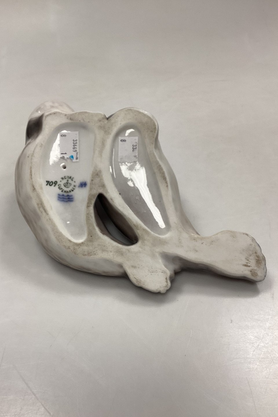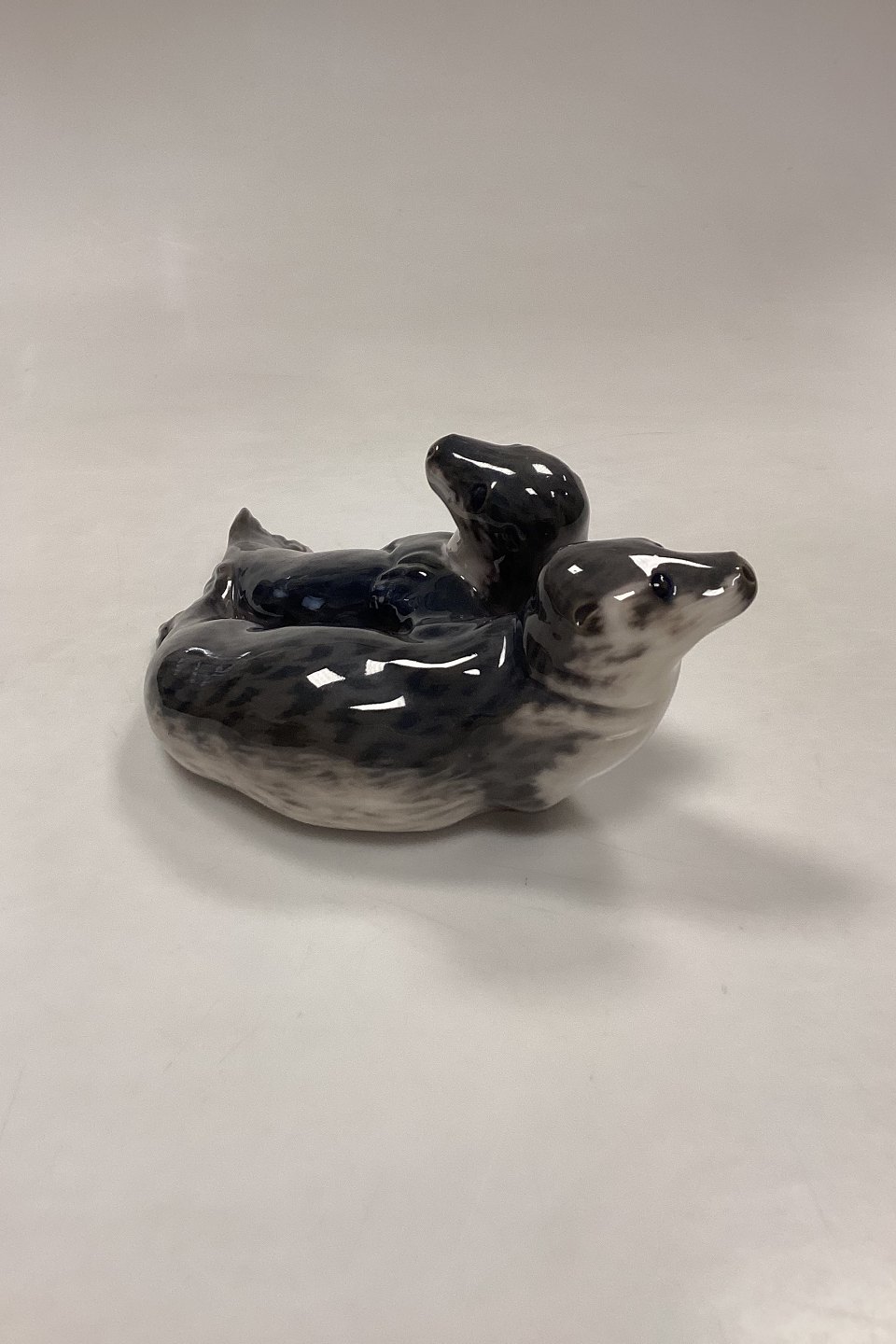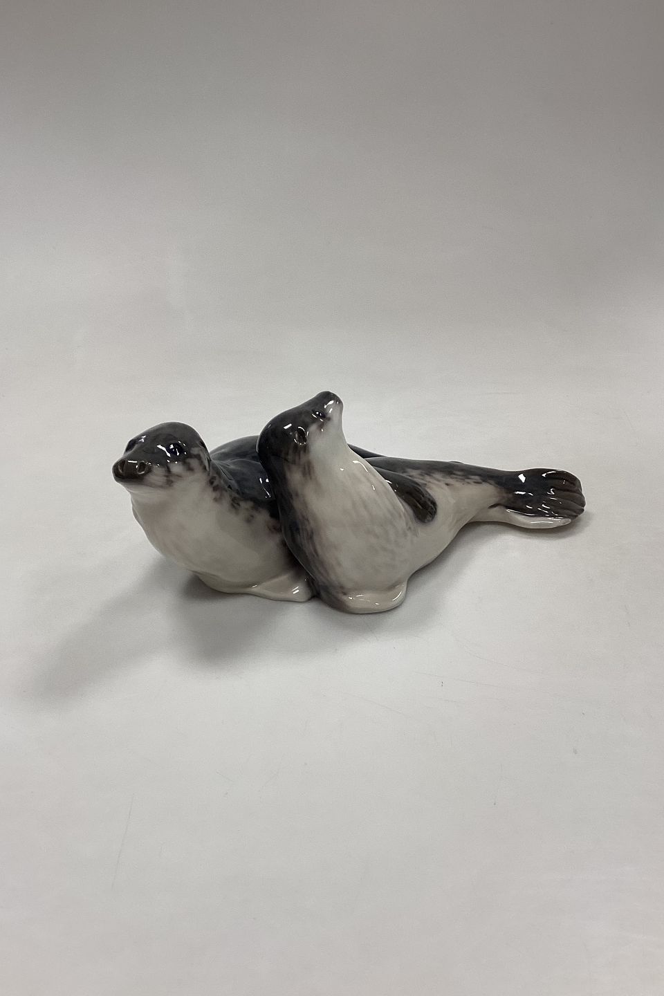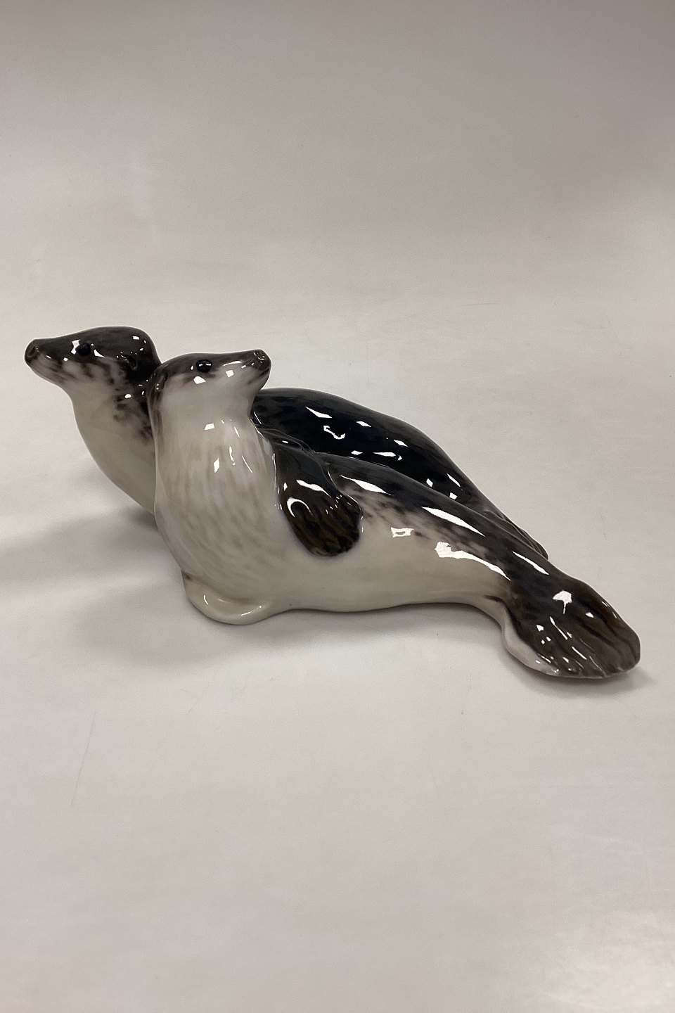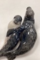 Beskrivelse: Royal Copenhagen Figur af Sæler No. 709. Designet af Erik Nielsen i 1906. Afslibninger af glasuren på den ene sæl, se foto. Sjælden figur i 2. Sortering.