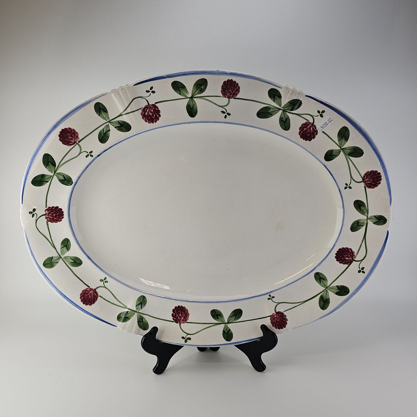 Beskrivelse: Ovalt fad i kunstfajance fra stellet Kløver. Nr. 181/359