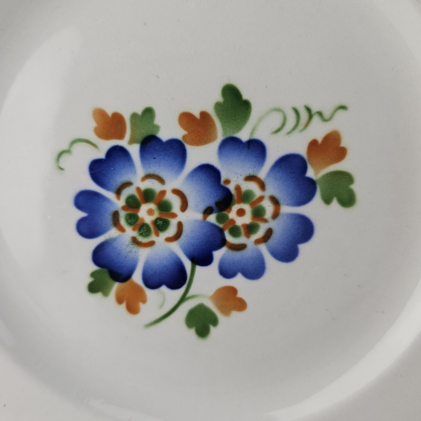 Hvidt fajancestel i stelform Sterling med motiv af blå blomster og blå prikker på kanten.