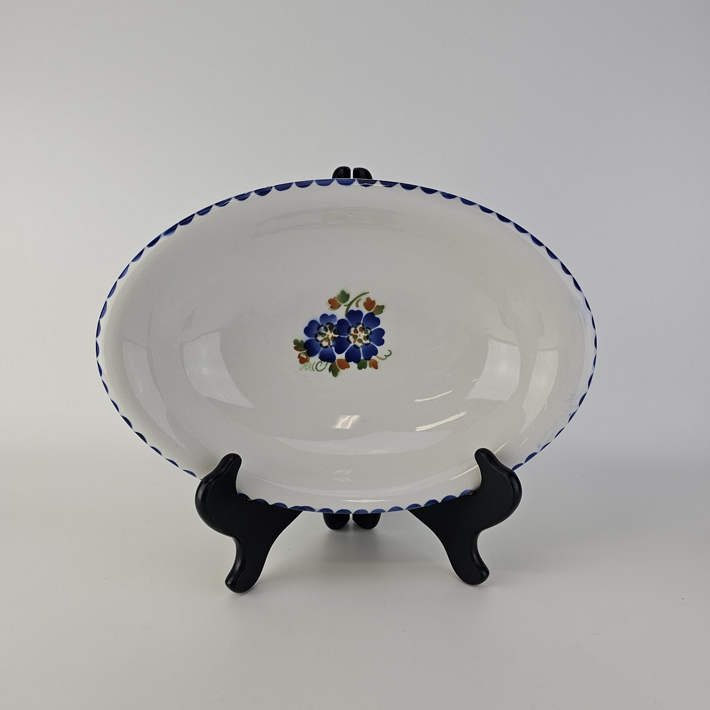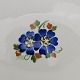 Beskrivelse: Dybt ovalt fad i fajance fra stellet Geranium II fremstillet i perioden 1927-1940.