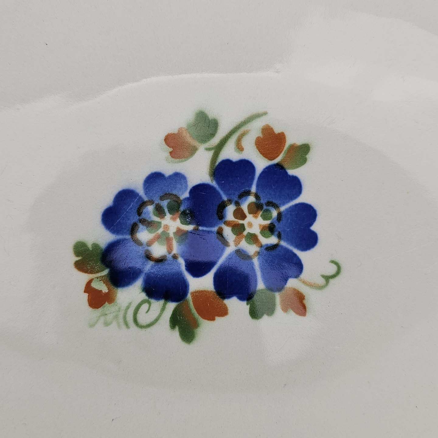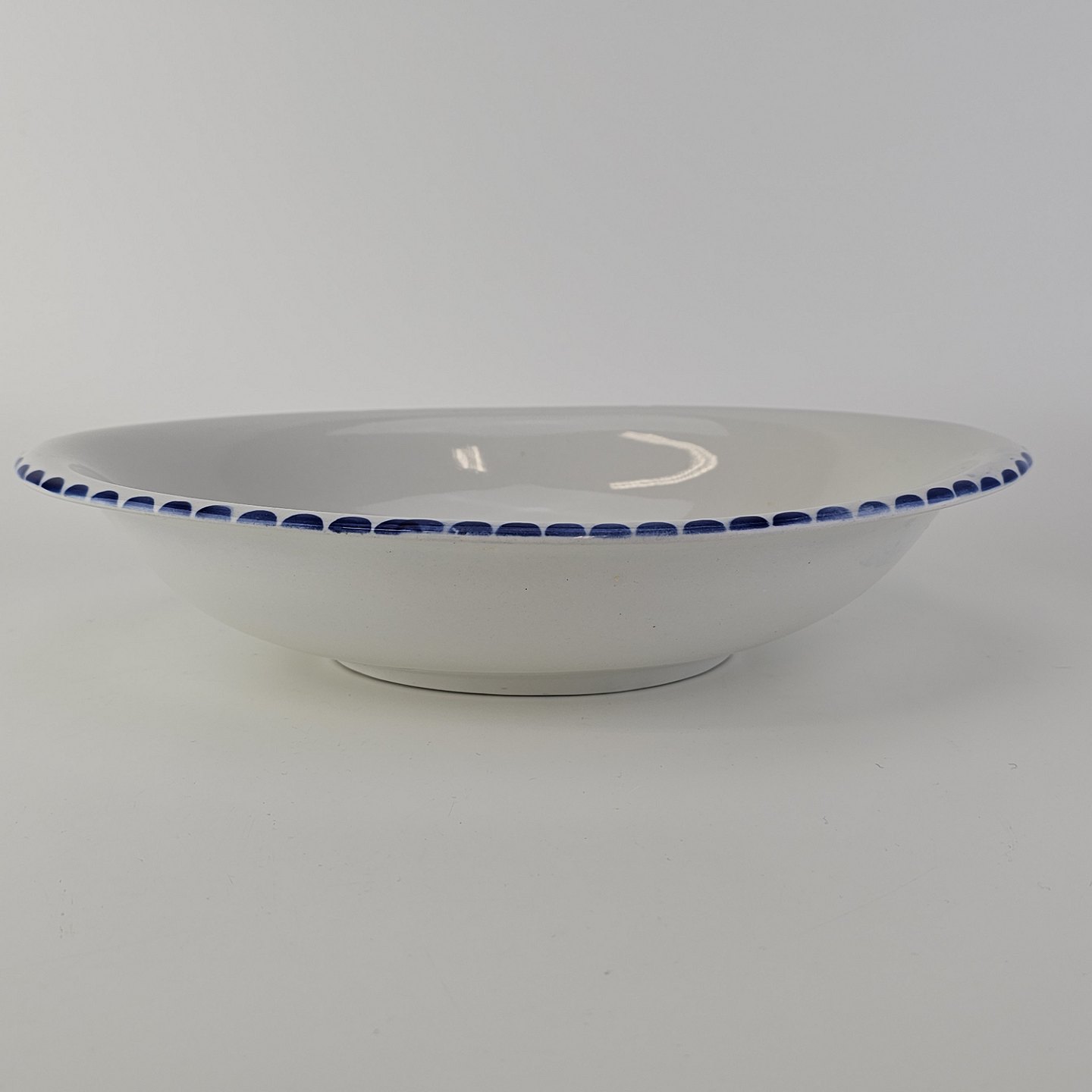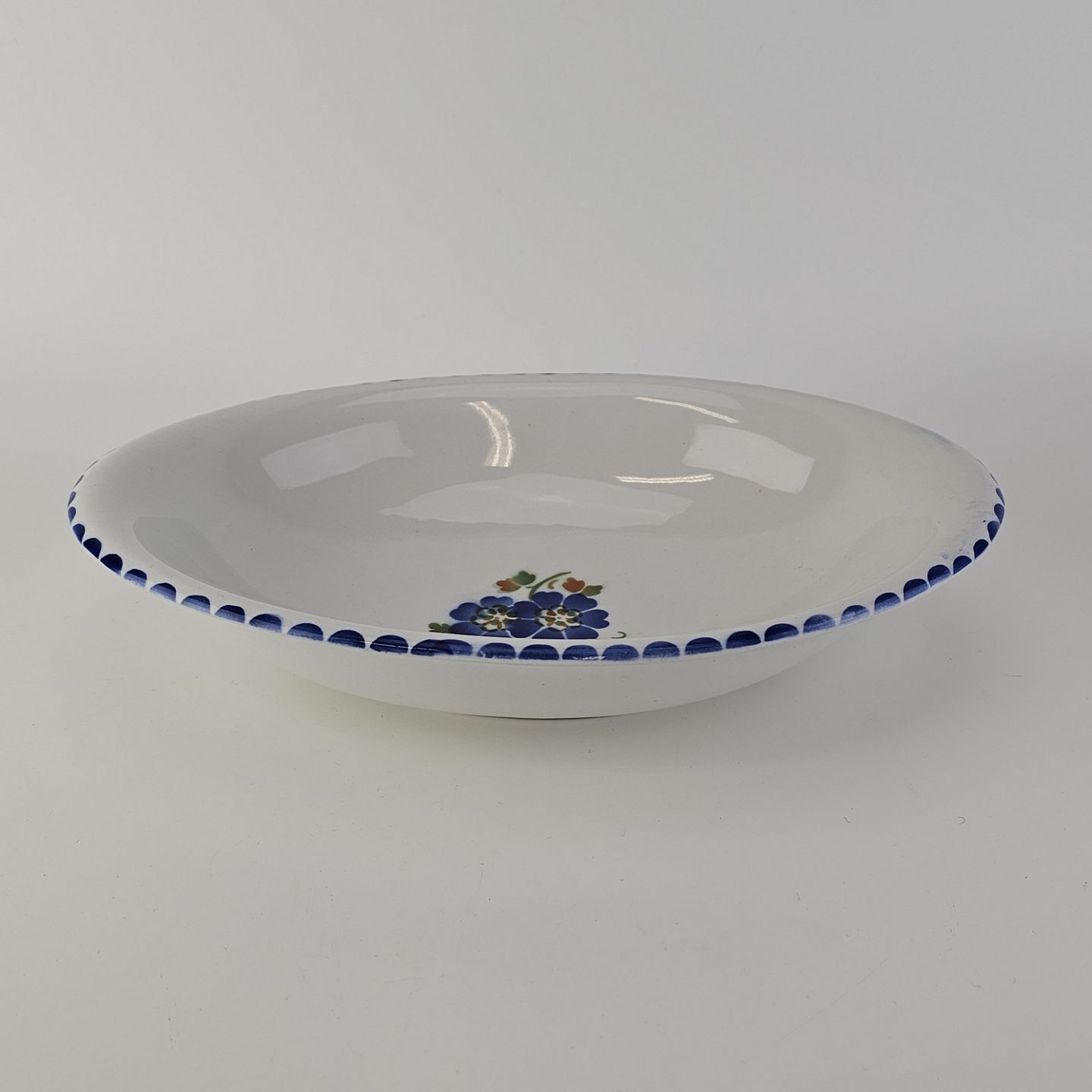 Hvidt fajancestel i stelform Sterling med motiv af blå blomster og blå prikker på kanten.