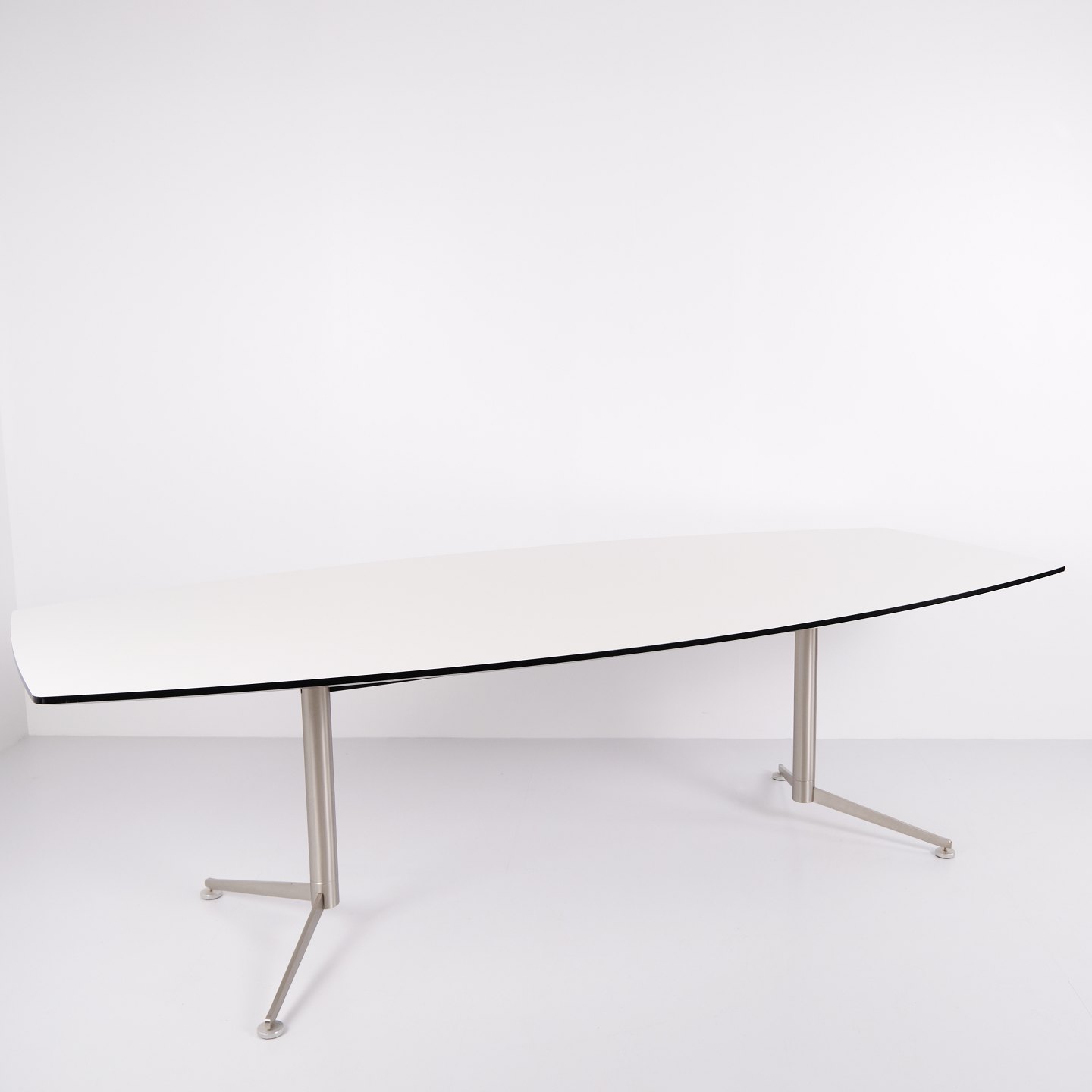 Beskrivelse: Paustian konferencebord model SP64 Spinal i hvid laminat med stel i børstet stål. Dansk design med funktionelt og moderne udtryk.