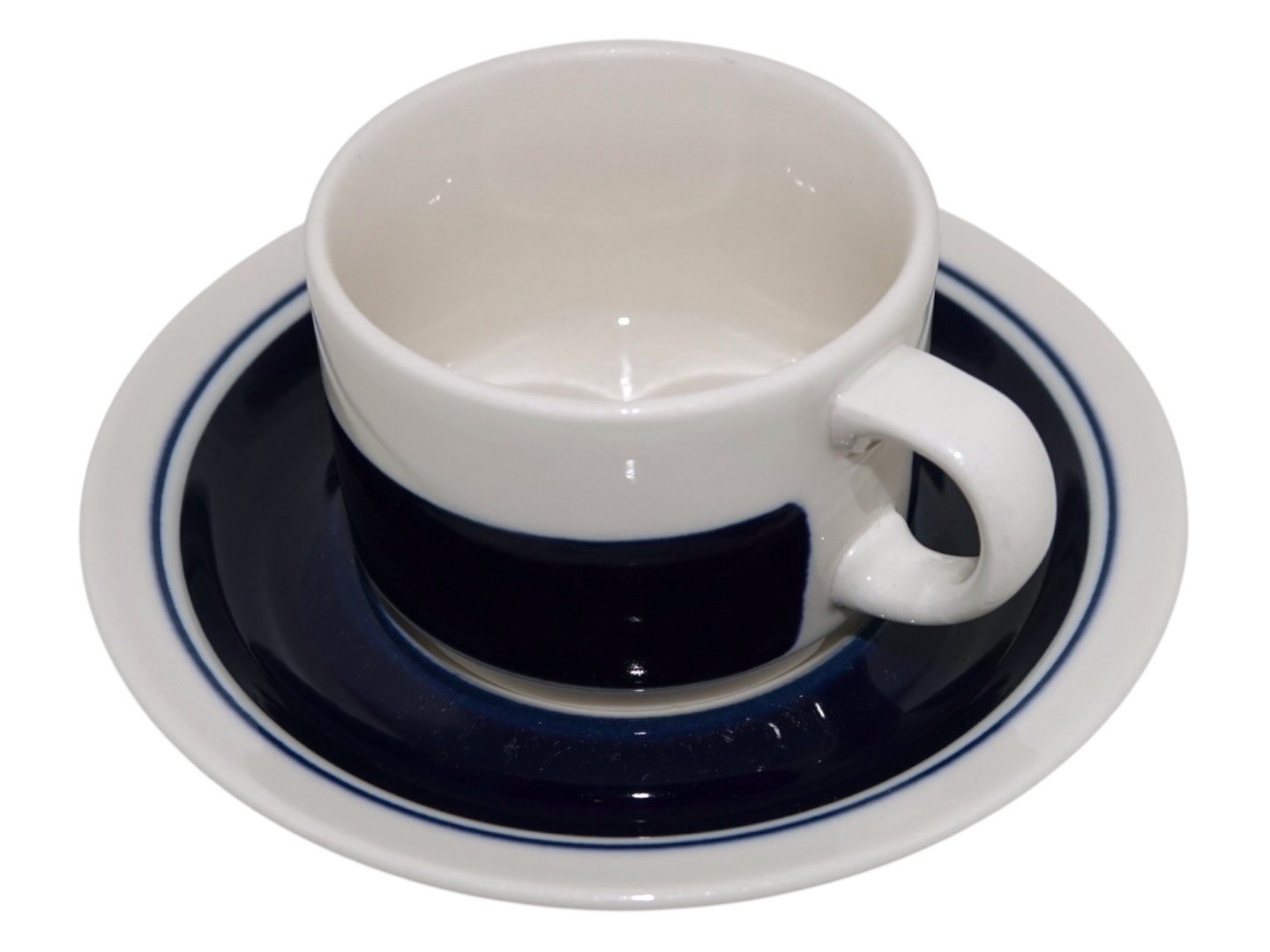 Description: Arabia Finland Kasino, dark blue coffee cup with matching saucer.