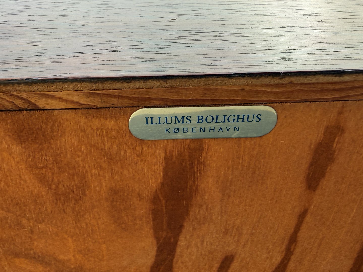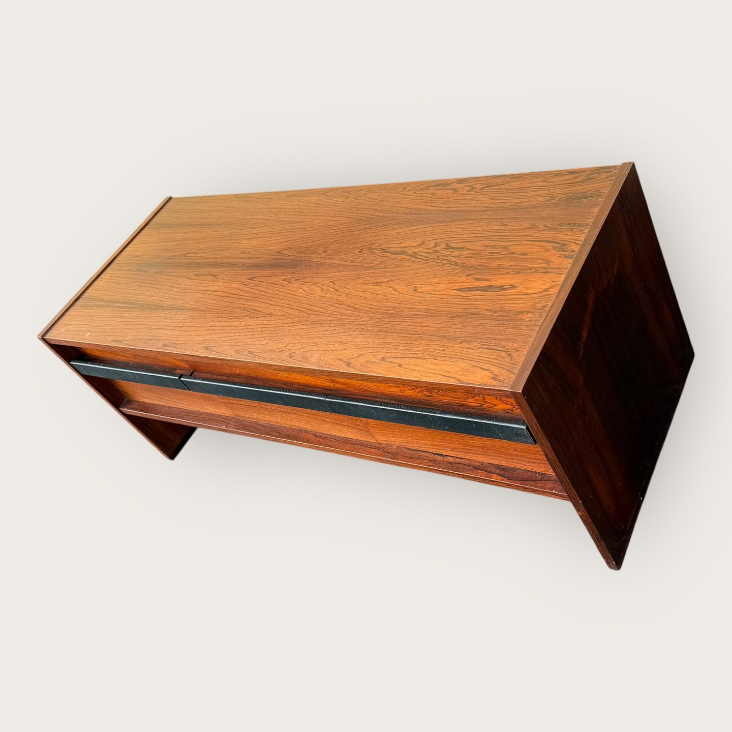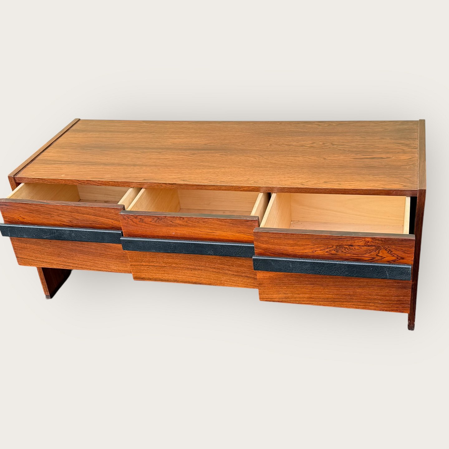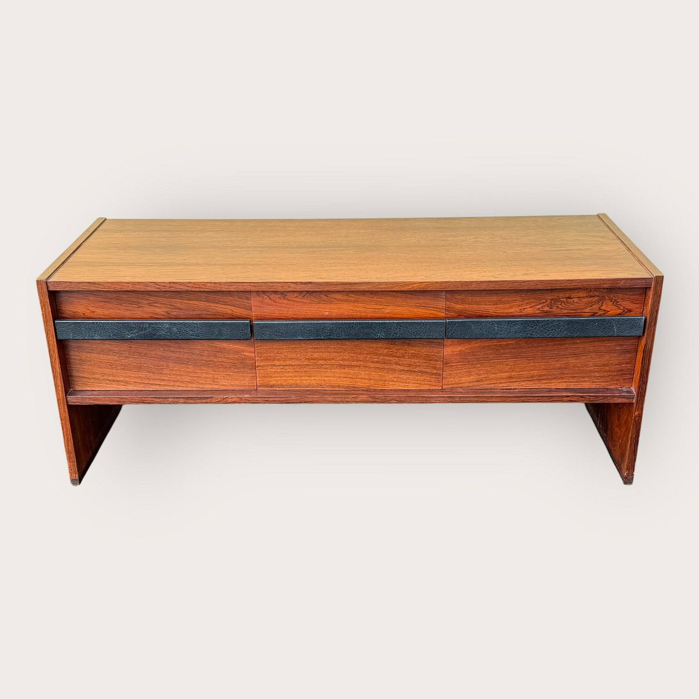 Beskrivelse: Lav skænk i palisander finer, tre skuffer med læderbetrukne håndtag, Udgået og mærket fra Illums Bolighus, Mål: HxBxD 46x116x45cm, har været stort entresæt i kombination med Palisanderspejlet varnr. 632831 *Fremstår i pæn brugt stand med få brugsspor*