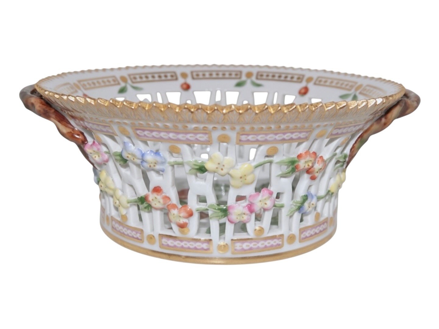 Beskrivelse: Royal Copenhagen Flora Danica, rund frugtkurv.