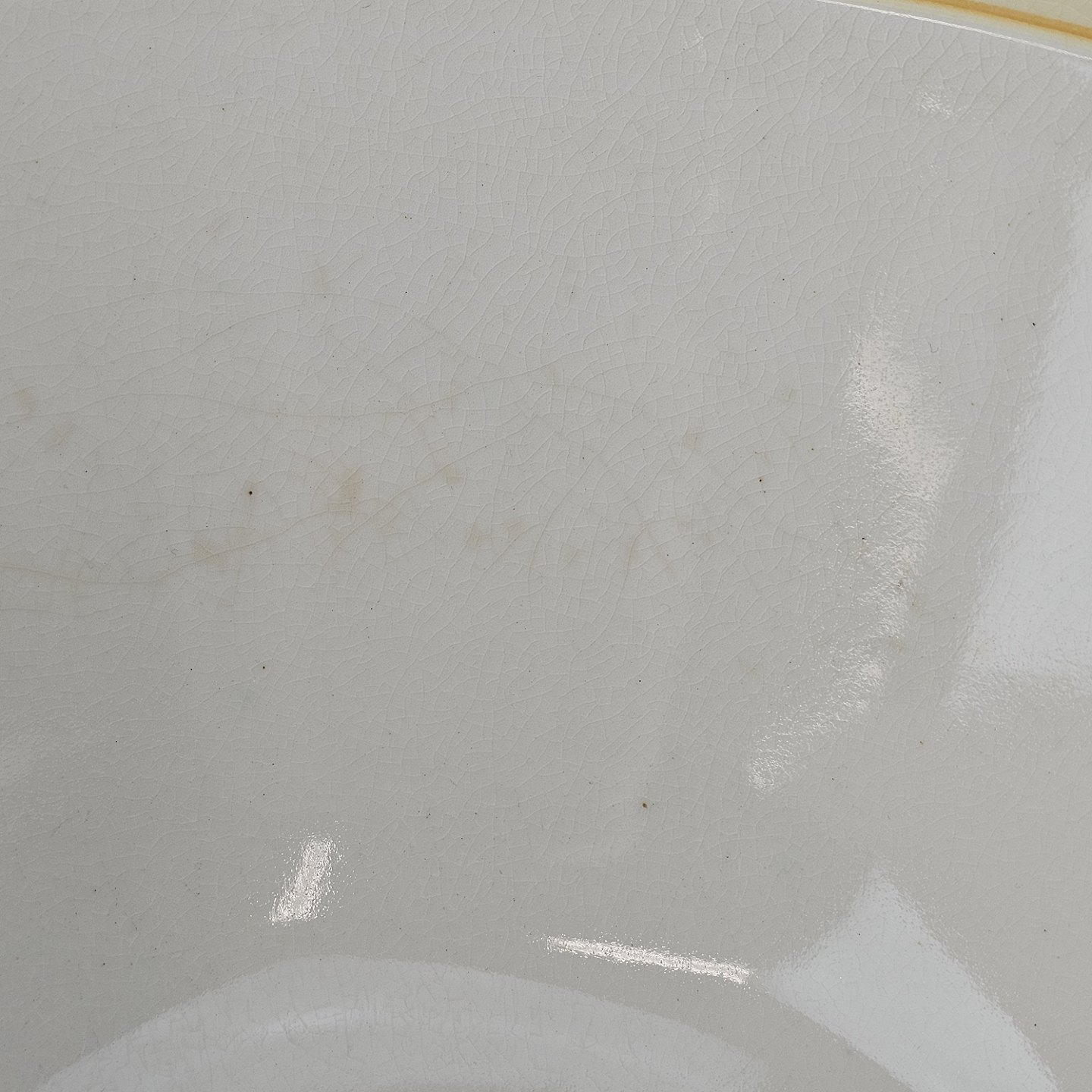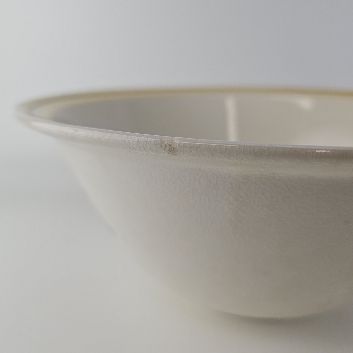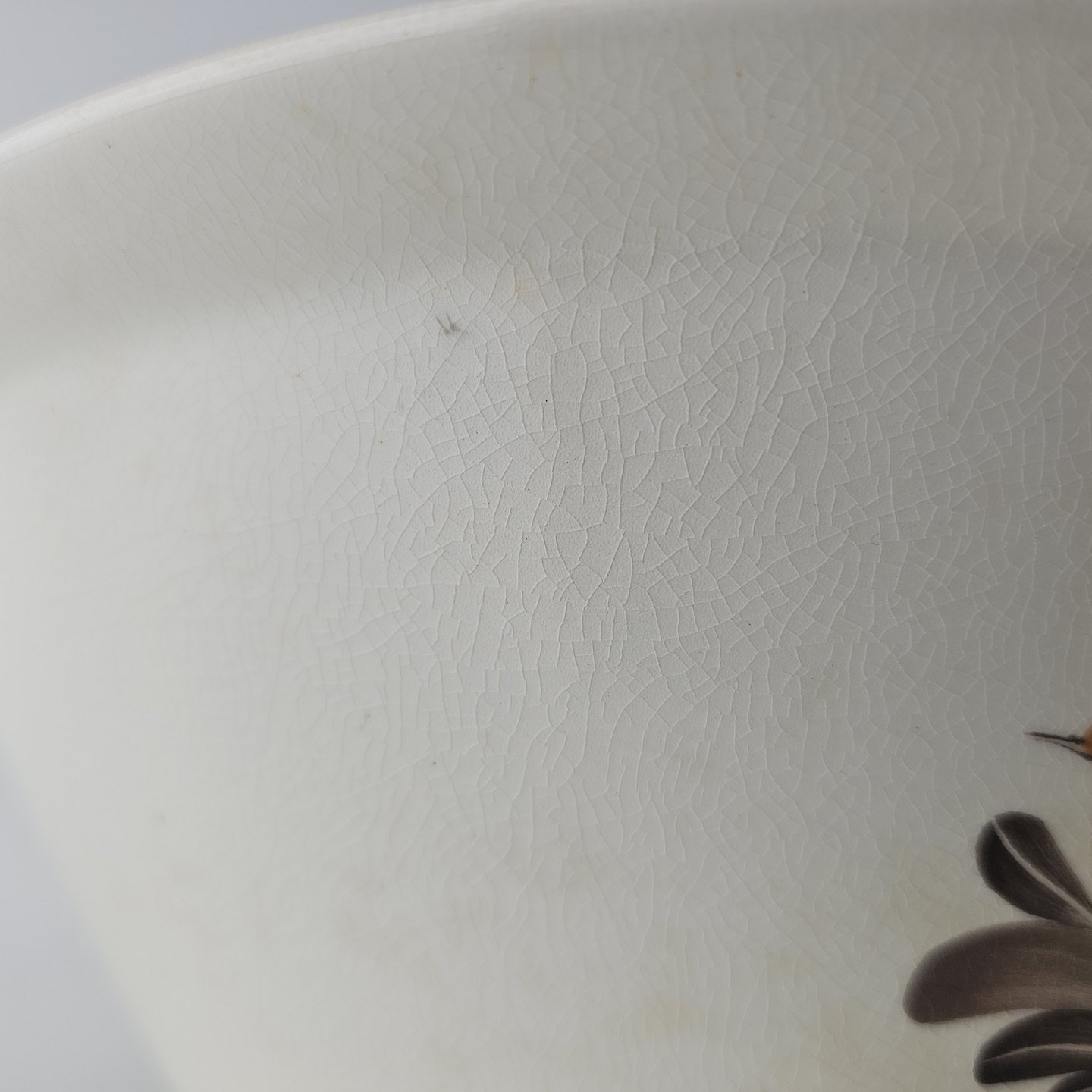 Fremstår med krakelering, et lille hak og små prikker under glasuren