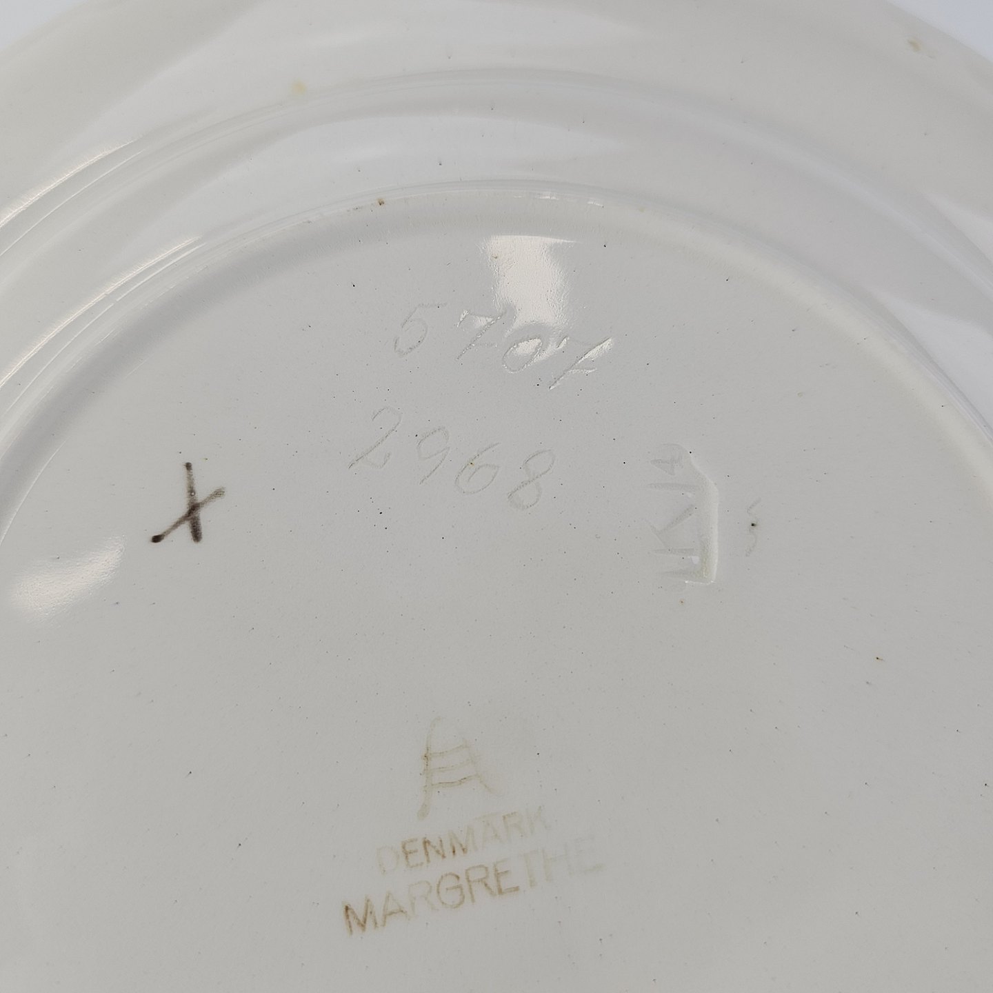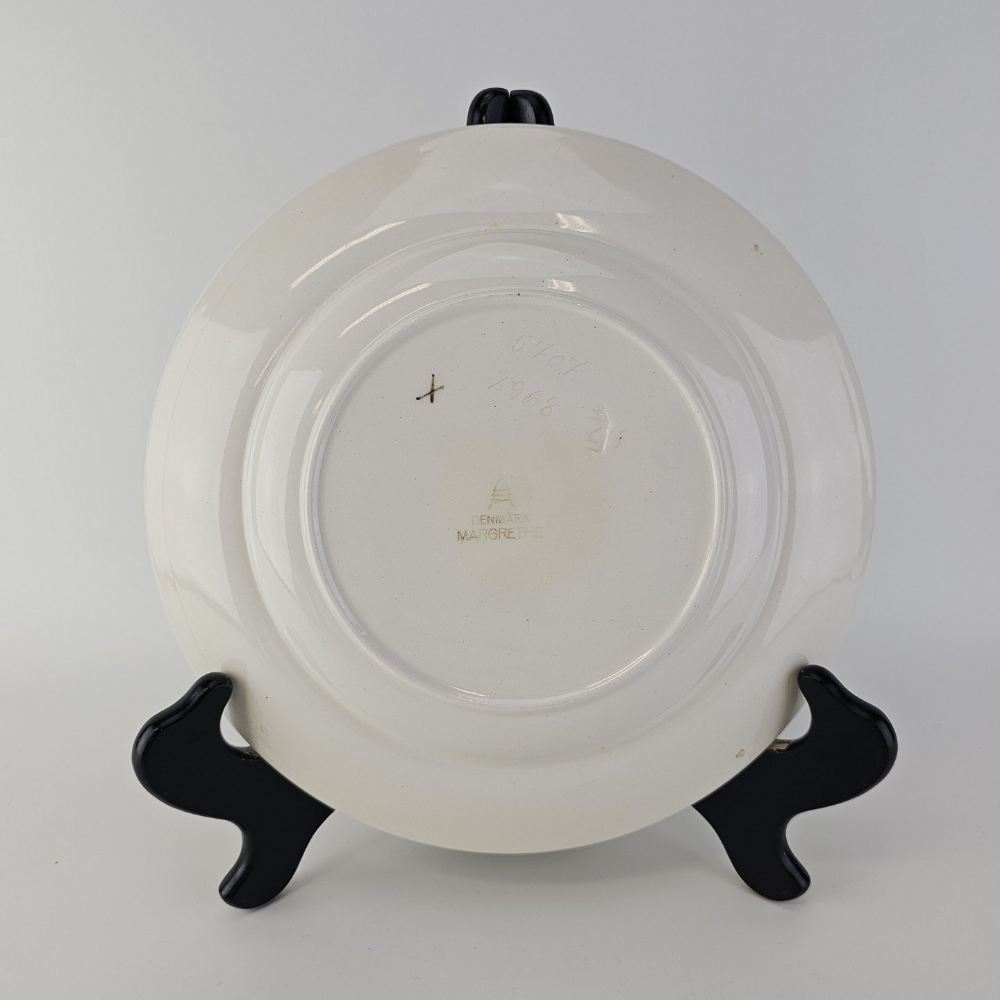 Beskrivelse: Flad frokosttallerken i fajance fra stellet Margrethe fremstillet i perioden 1937-1940.