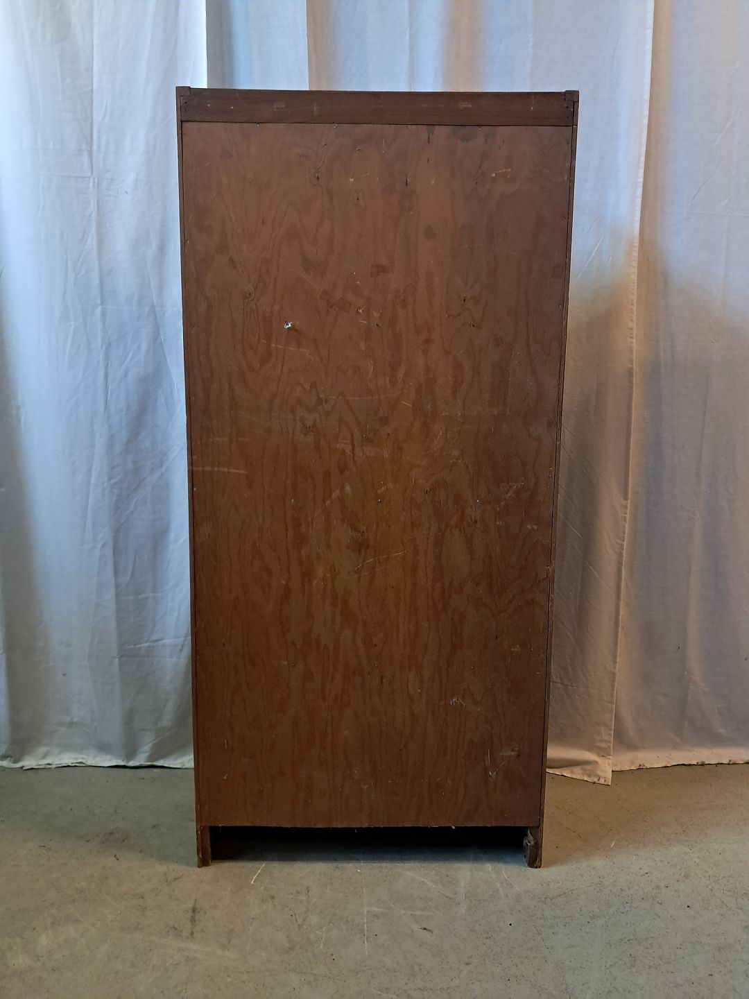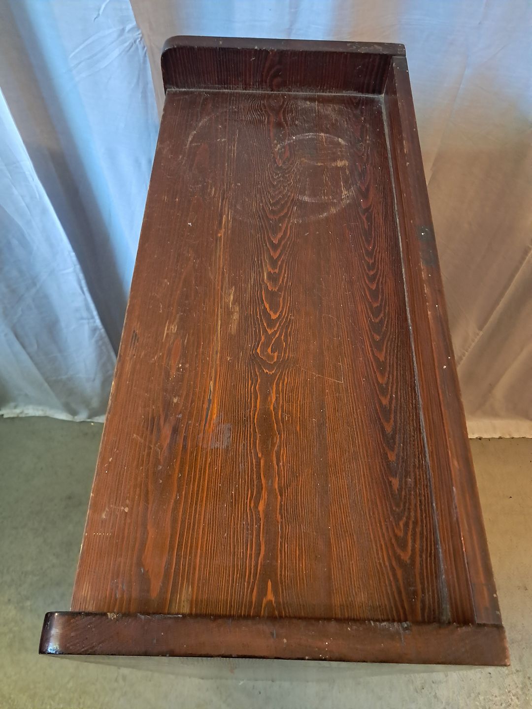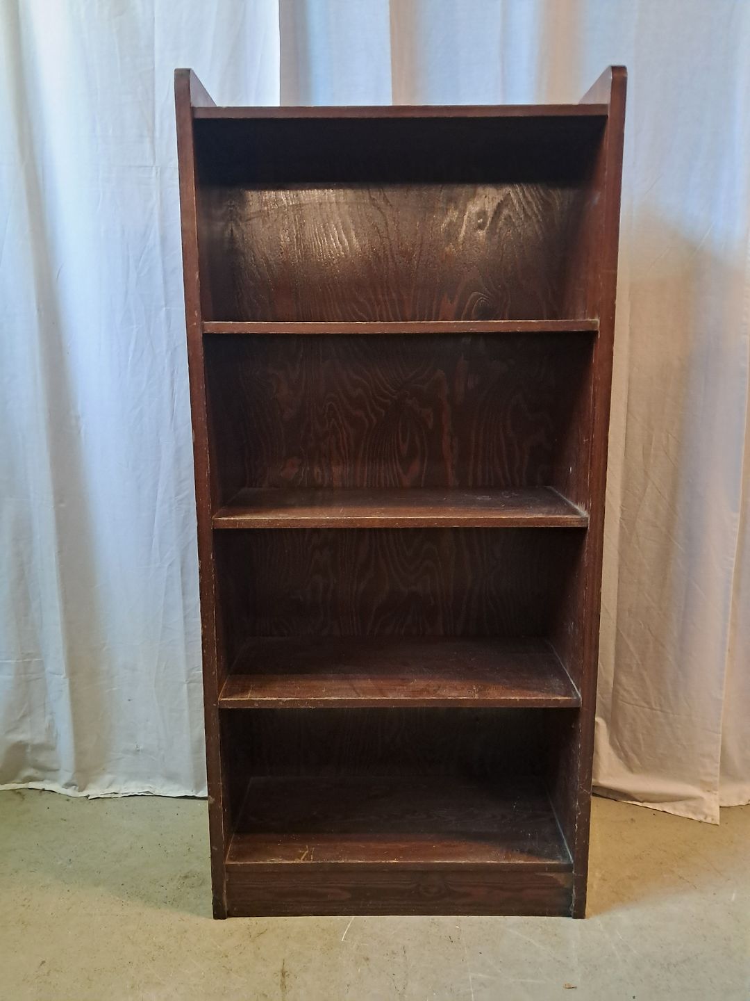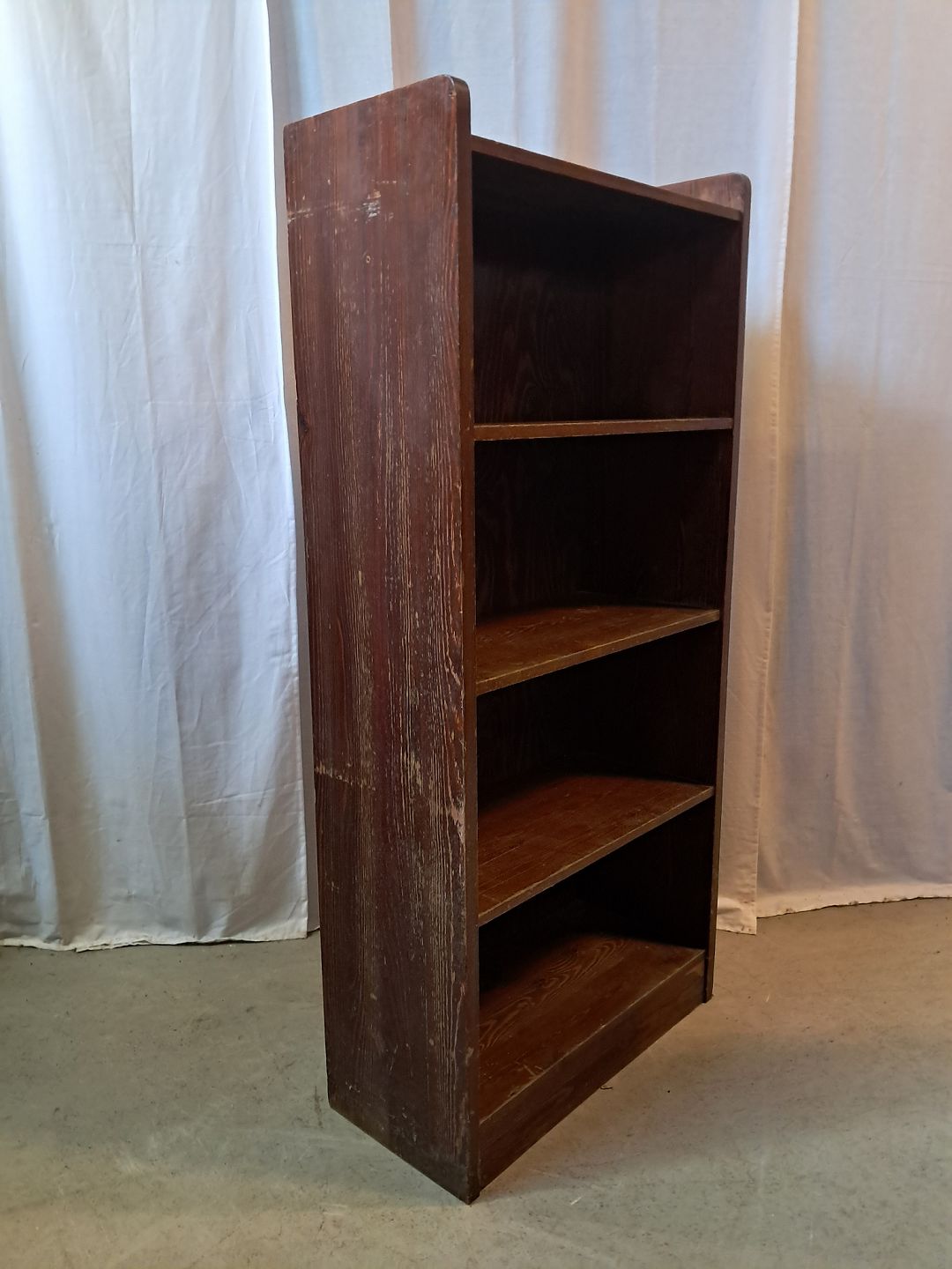 Beskrivelse: Reol i massivt bejdset og lakeret fyrretræ, fra 1950erne.
