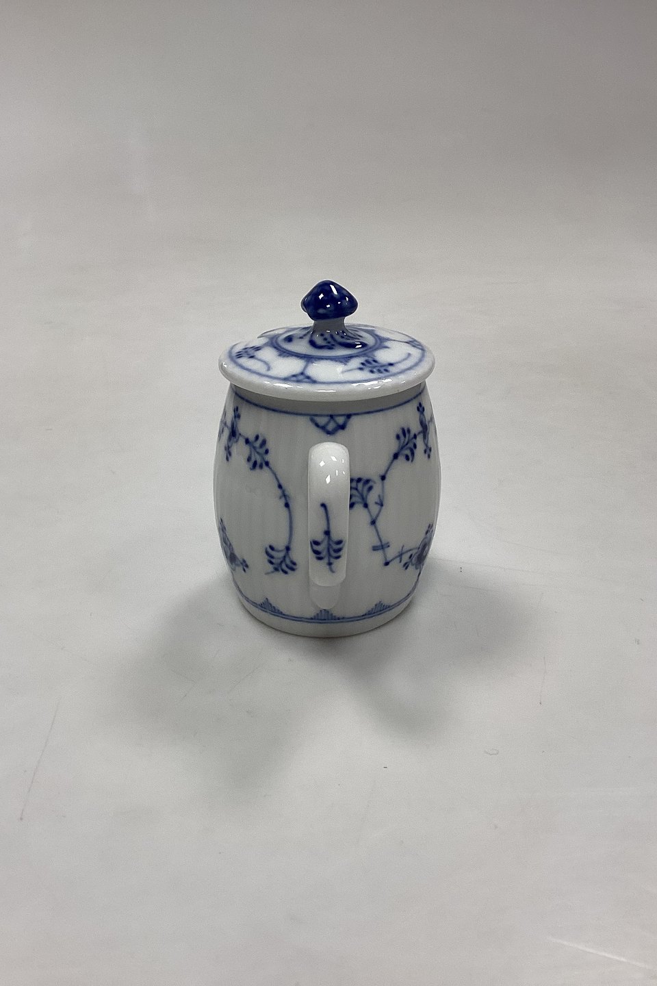 Beskrivelse: Royal Copenhagen Musselmalet Riflet Sennepskrukke med låg No. 137