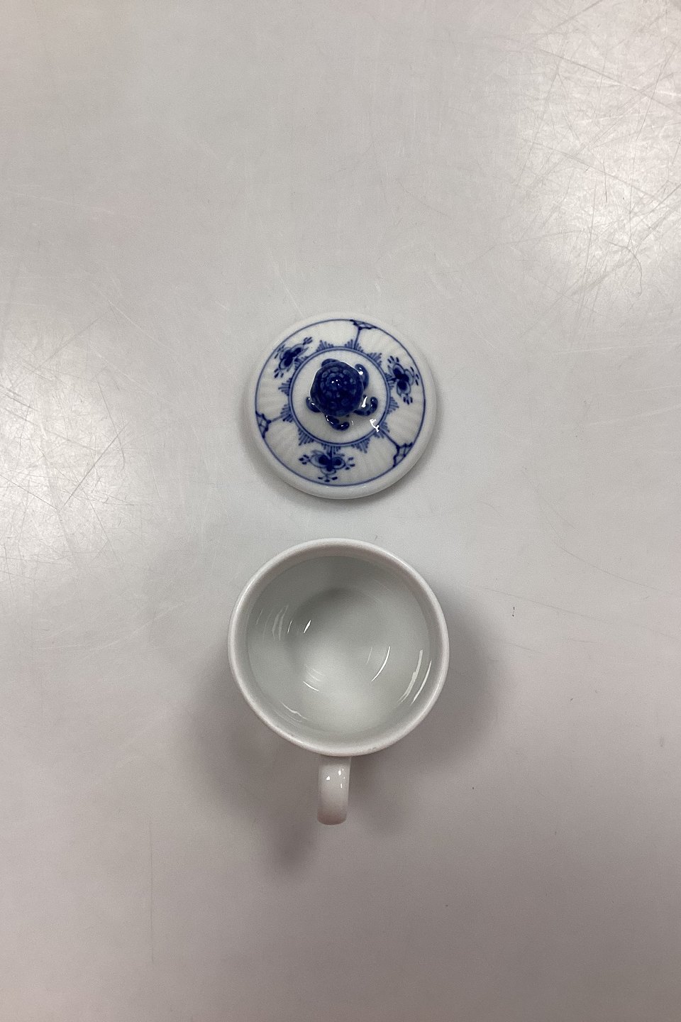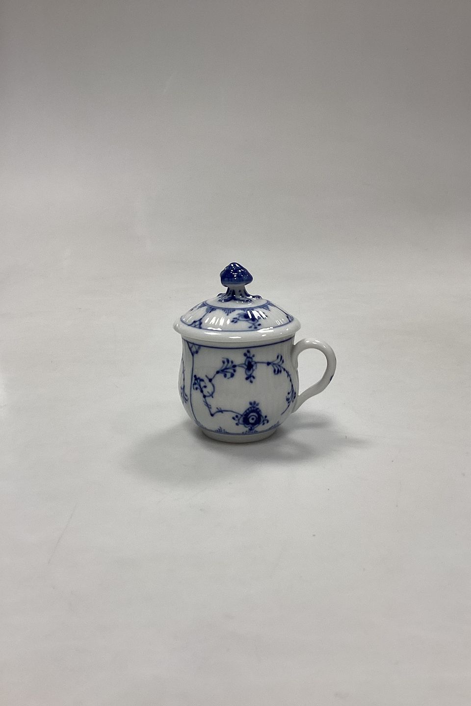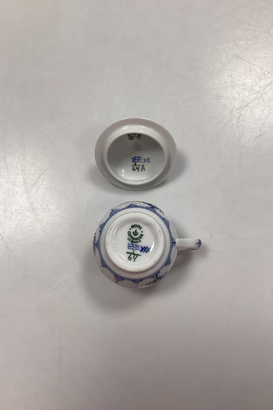Beskrivelse: Royal Copenhagen Musselmalet Riflet Crémekop No. 64 med låg No. 64A.