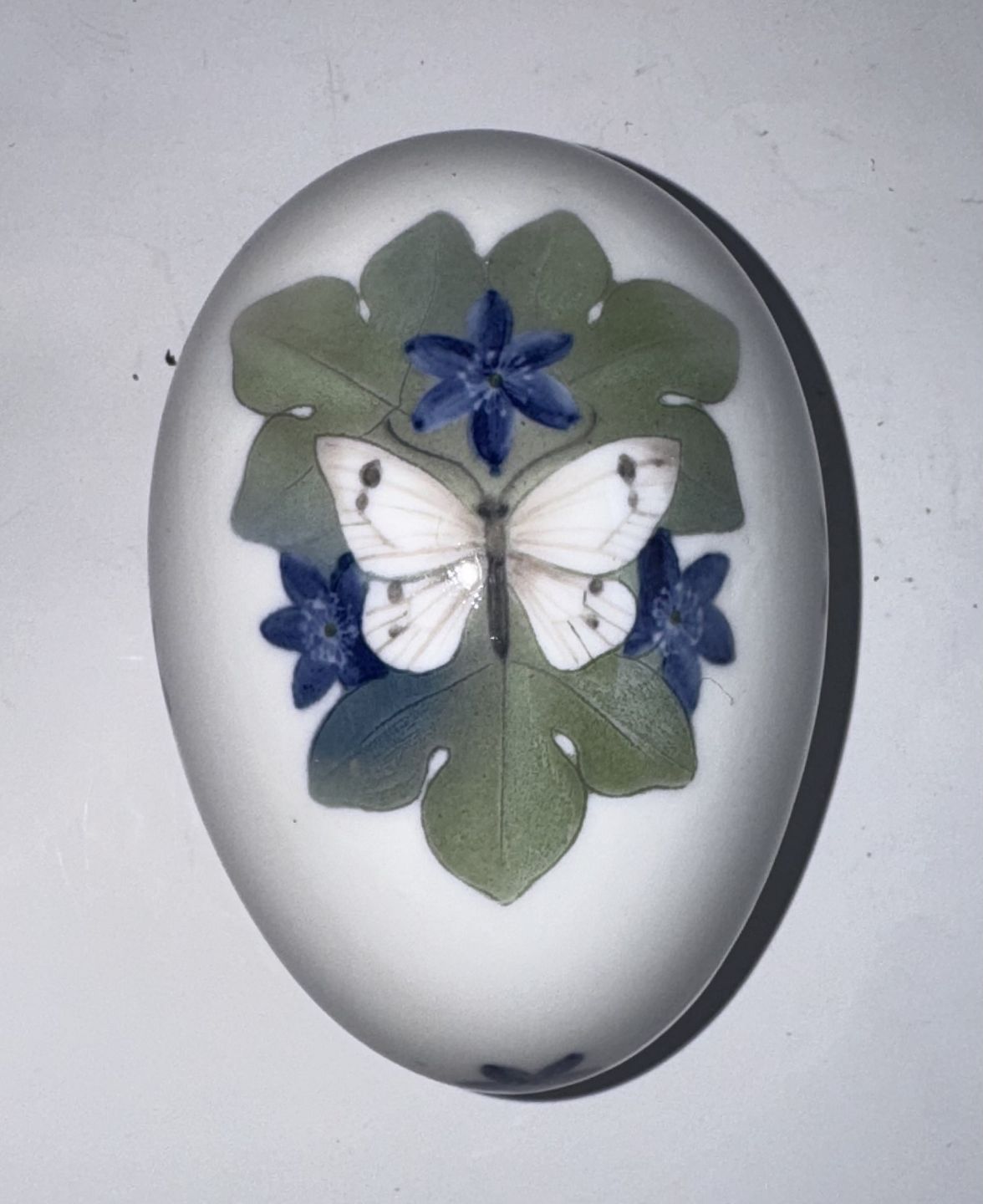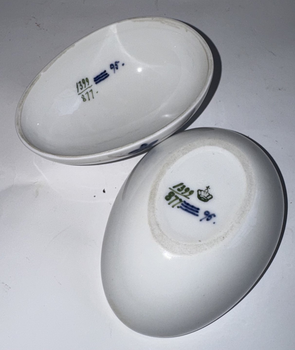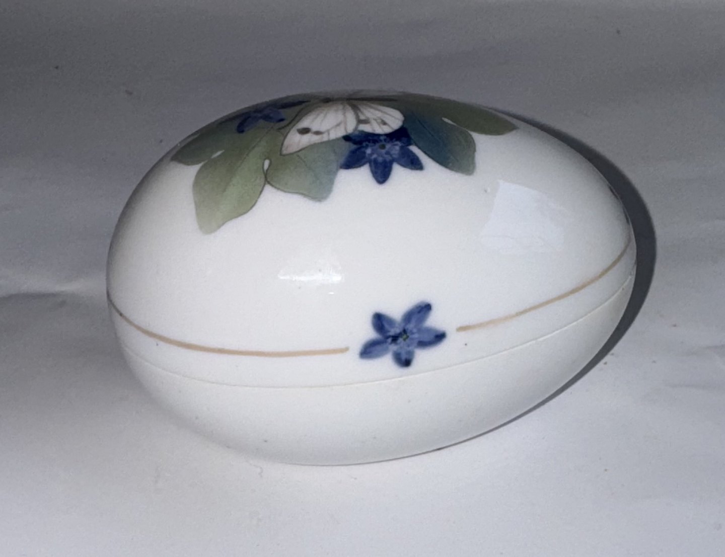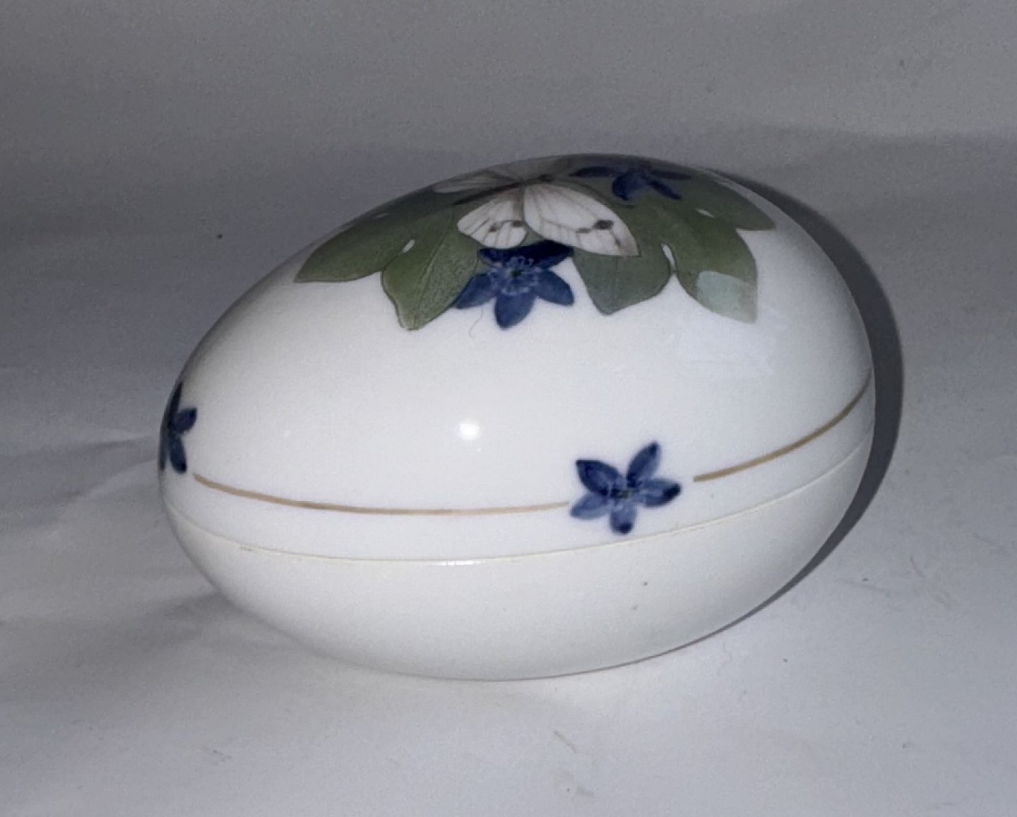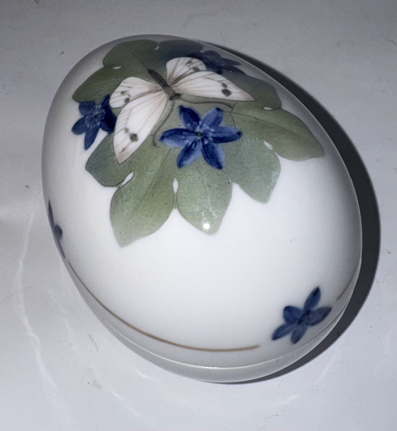 Beskrivelse: To-delt æg i porcelæn, underdel og låg, fra Royal Copenhagen. Dekoreret med en sommerfugl samt blomster. 1. sortering. I god stand. Begge dele fabriksmærket med fabrikslogo samt modelnummer 1399/877. Fremstillet omkring 1920. Mål: H. 7,2 cm, B. 7 cm L. 10 cm.