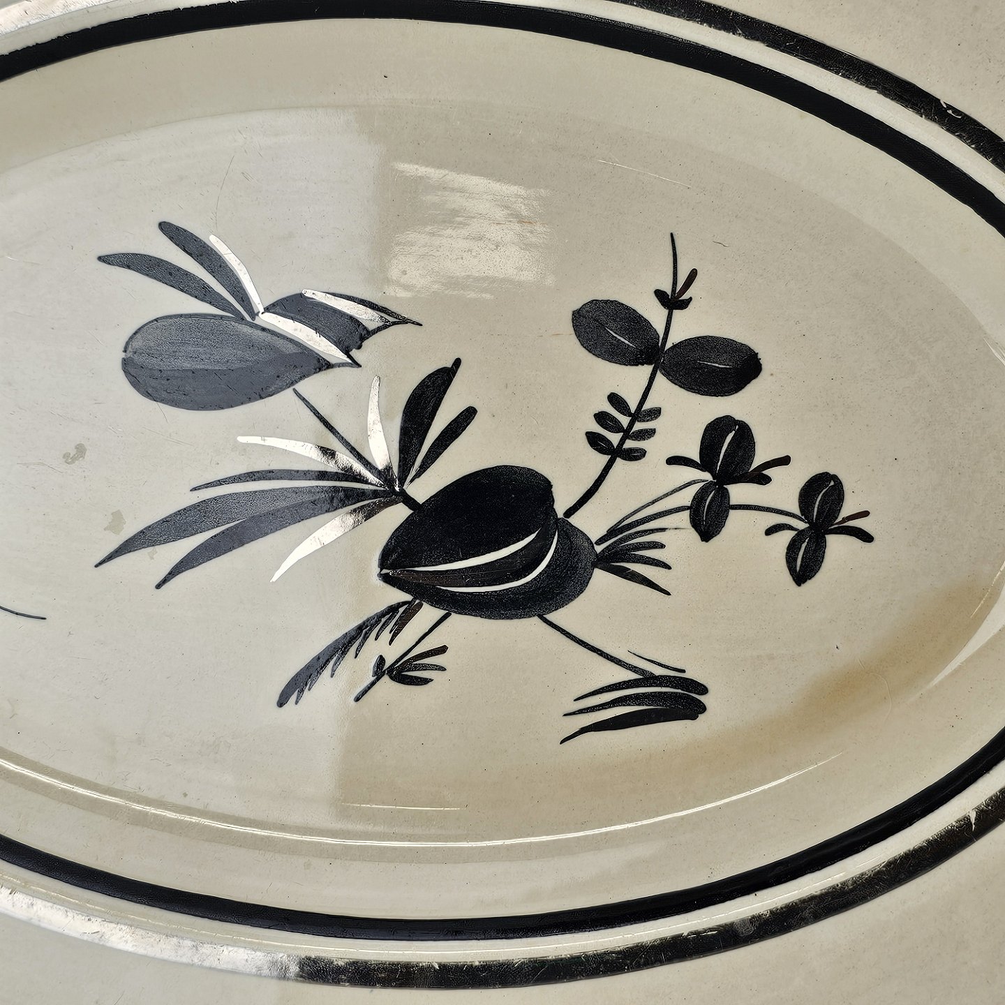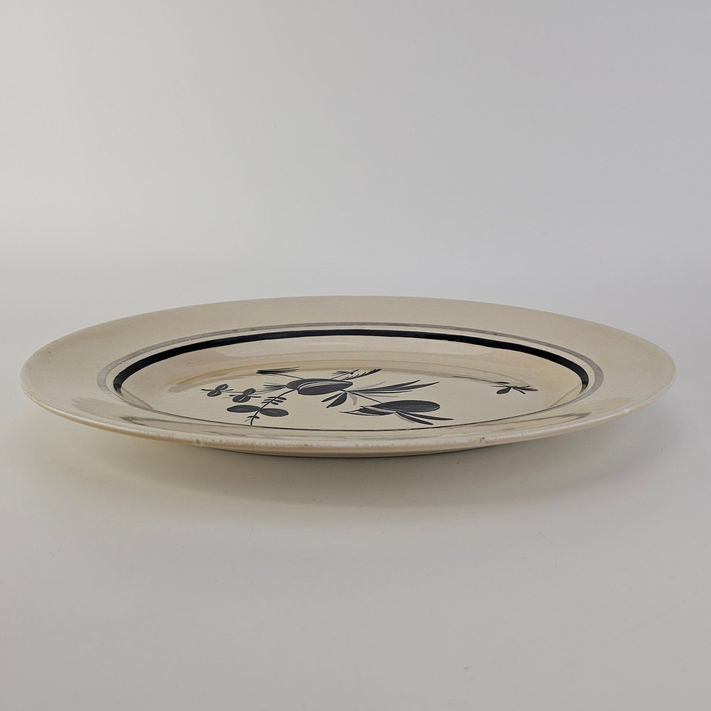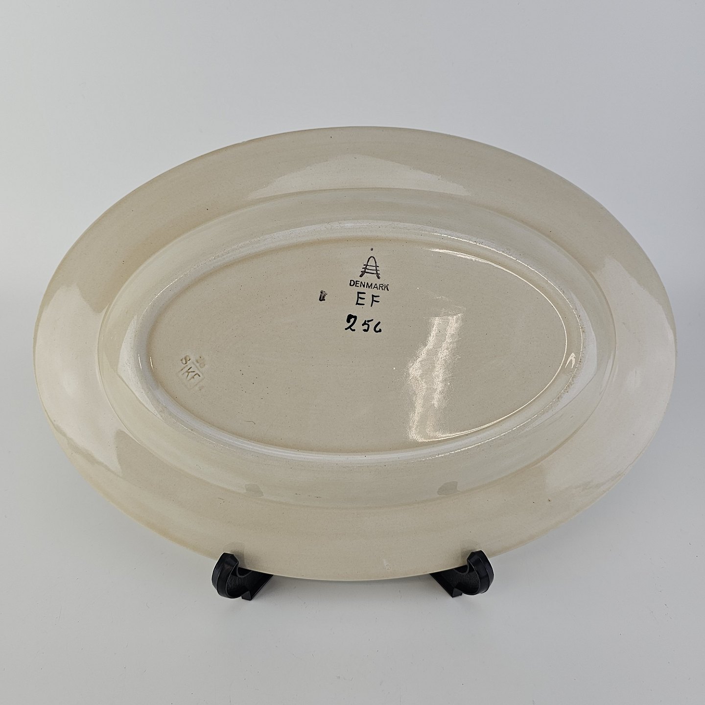 Beskrivelse: Ovalt fad i fajance fra stellet Dragsholm fremstillet i perioden 1934-1965.