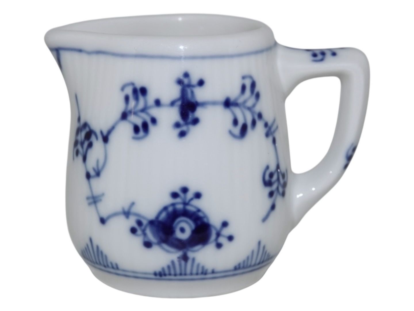 Beskrivelse: Royal Copenhagen Musselmalet Riflet i tykt jernporcelæn, miniature flødekande.
