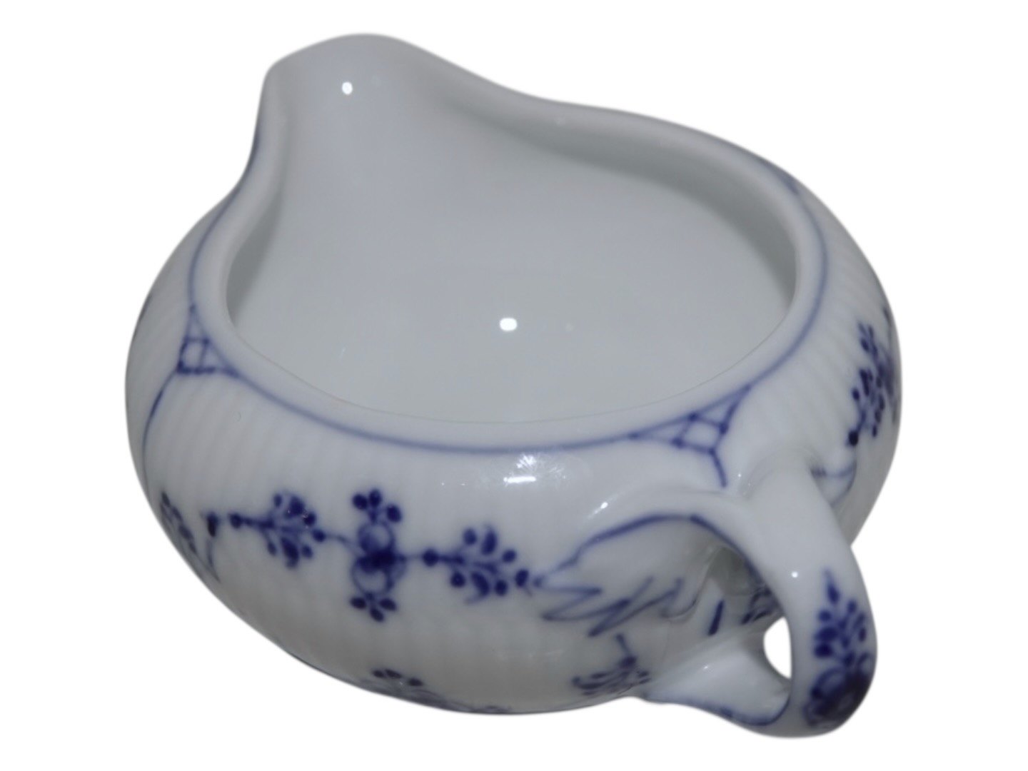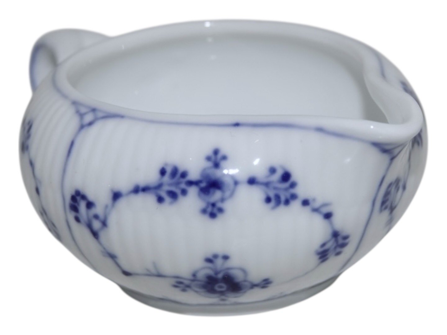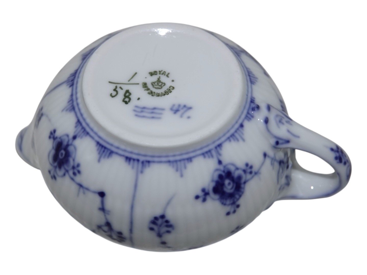 Beskrivelse: Royal Copenhagen Musselmalet Riflet, sjælden flødekande.