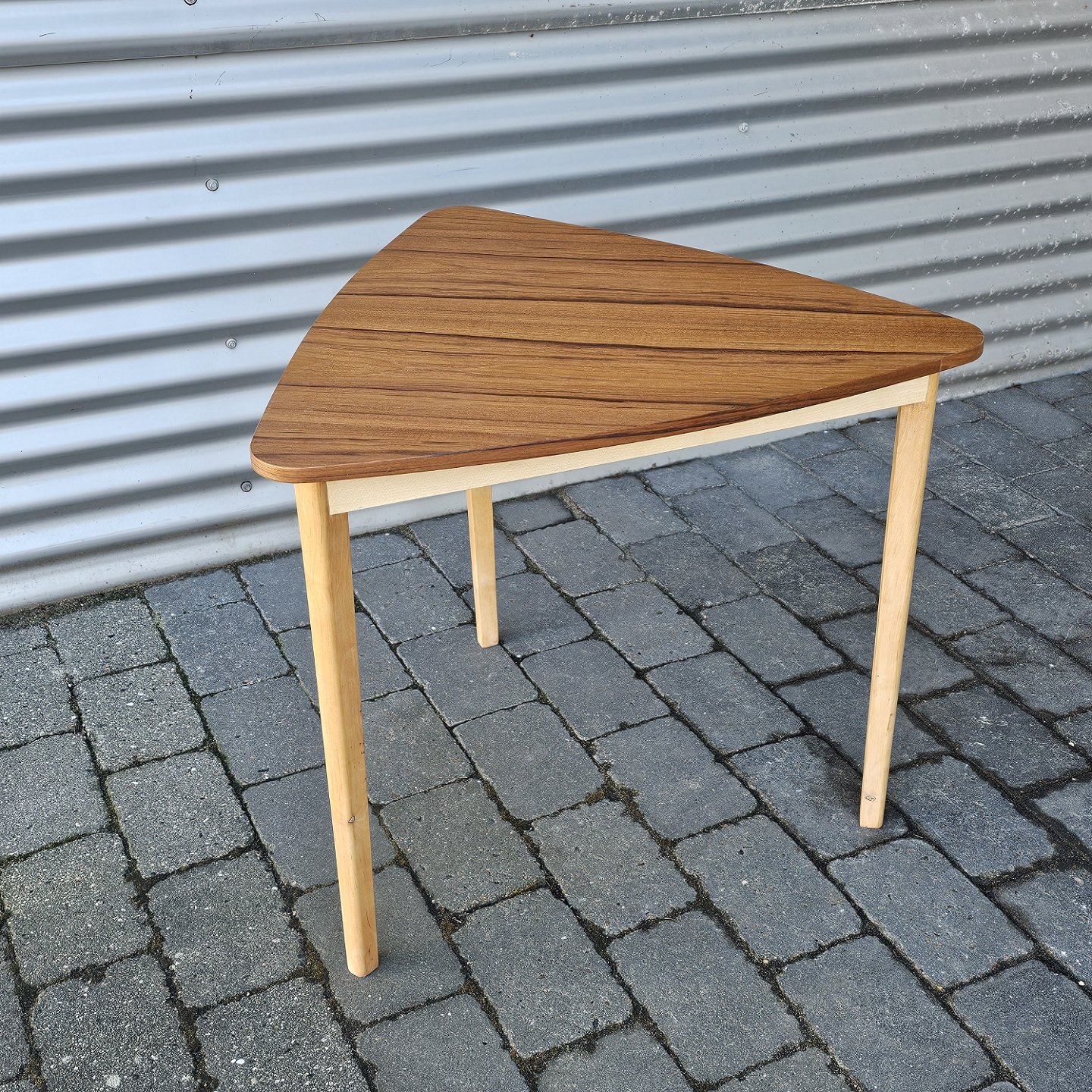 Beskrivelse: Trekantet sofabord med stel i bøg og bordplade i teaktræ