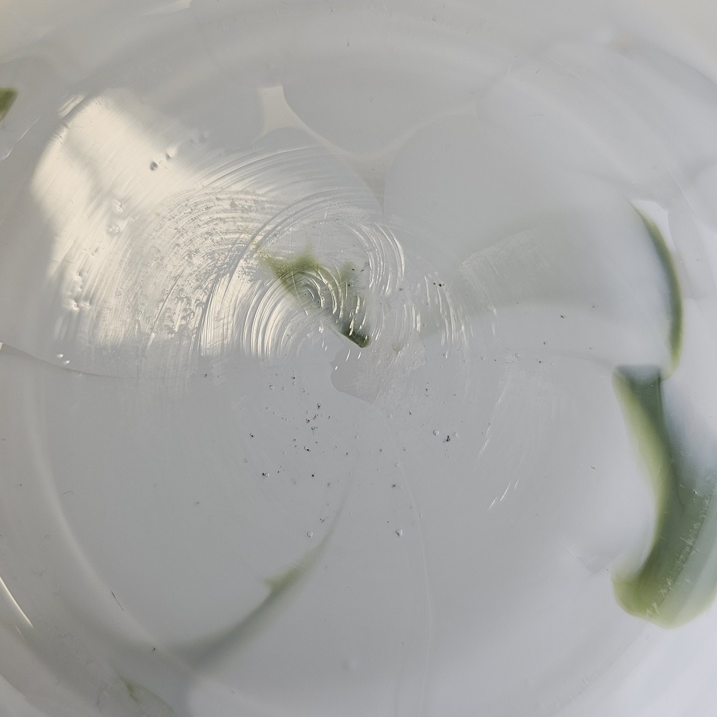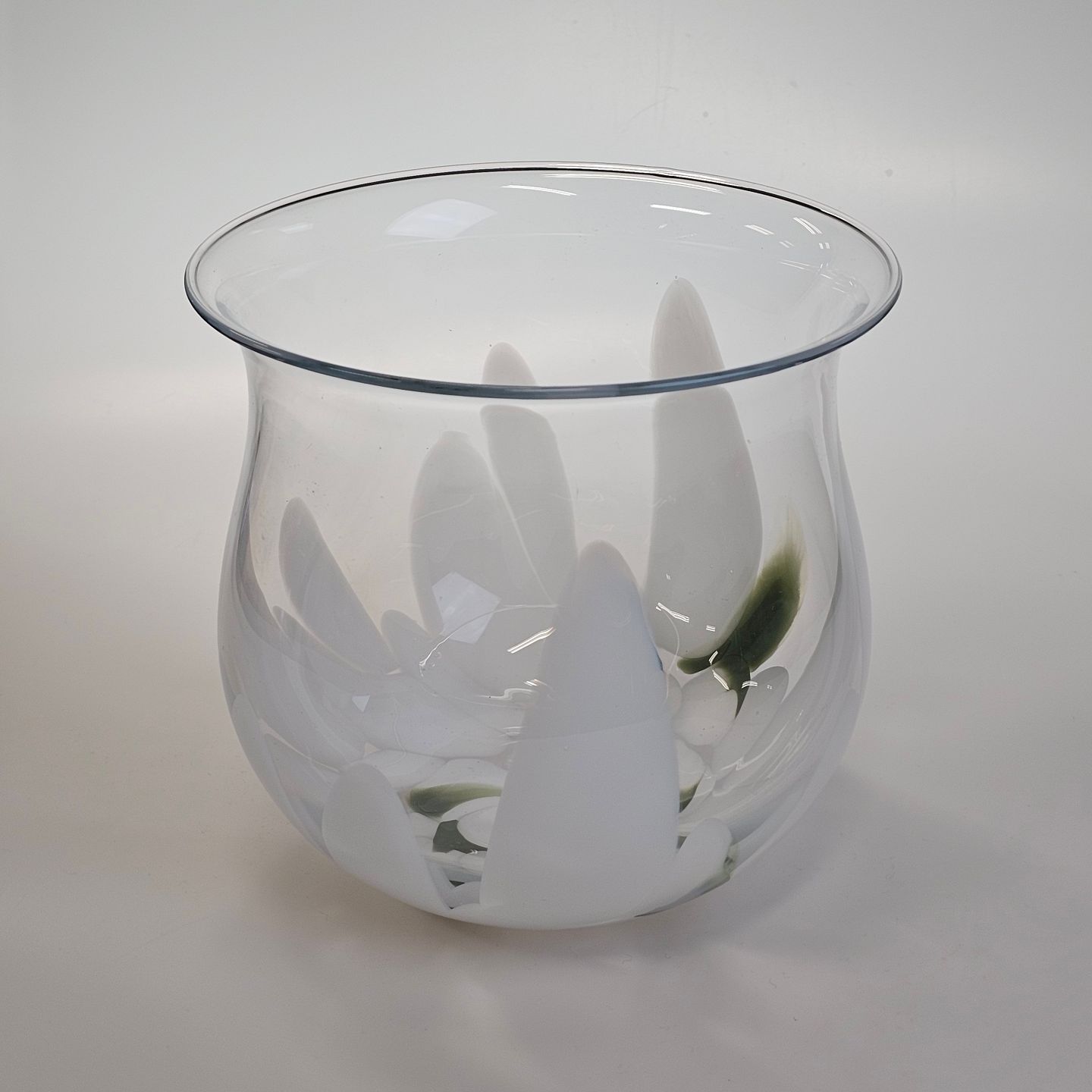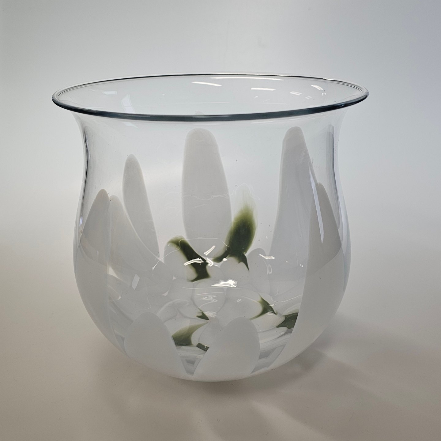 Beskrivelse: Vase i glas med hvid dekoration, model Vintergæk