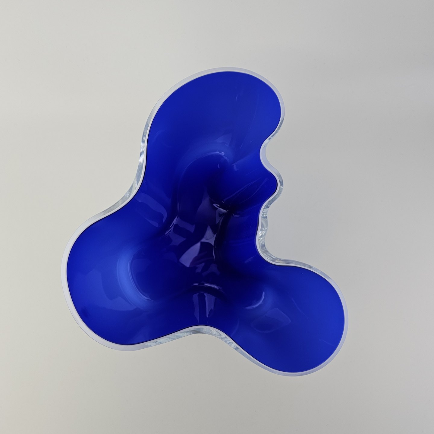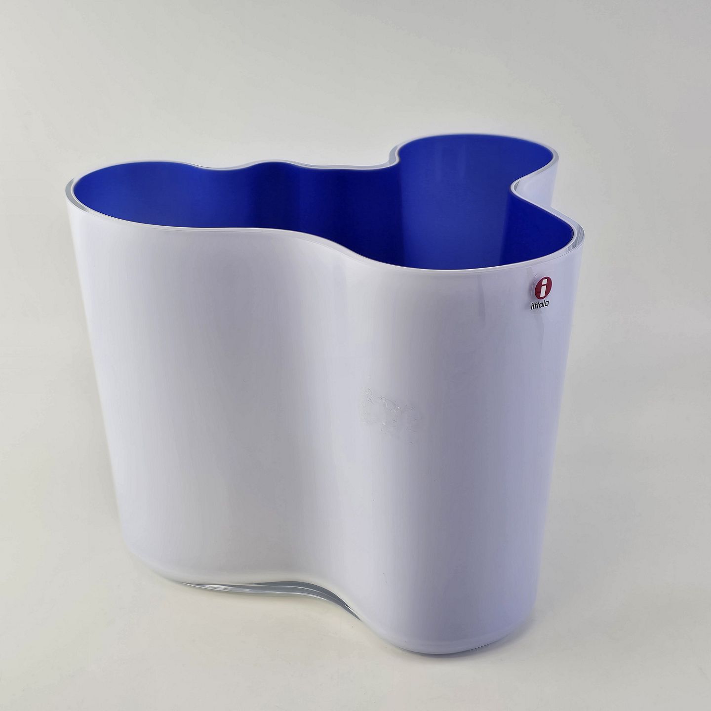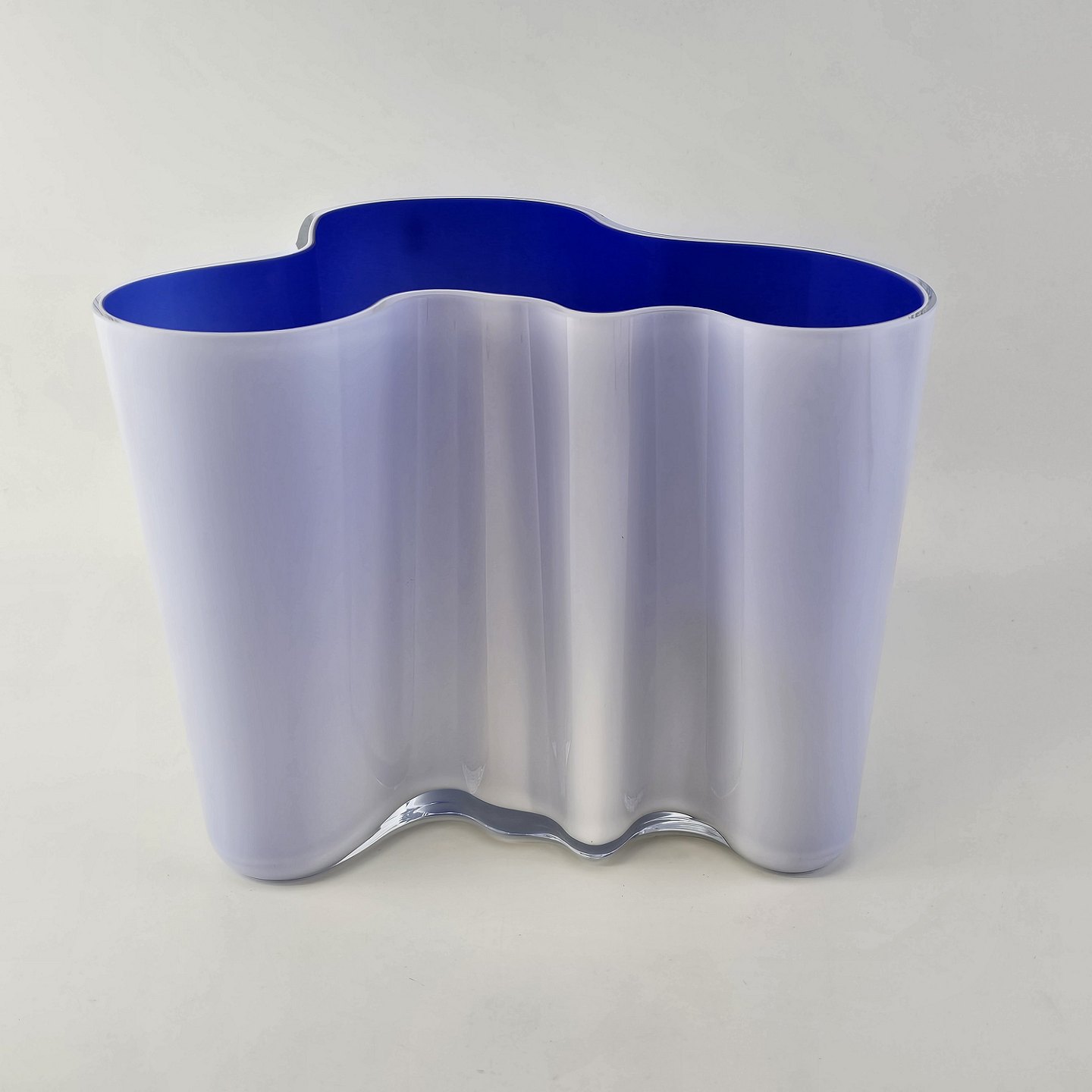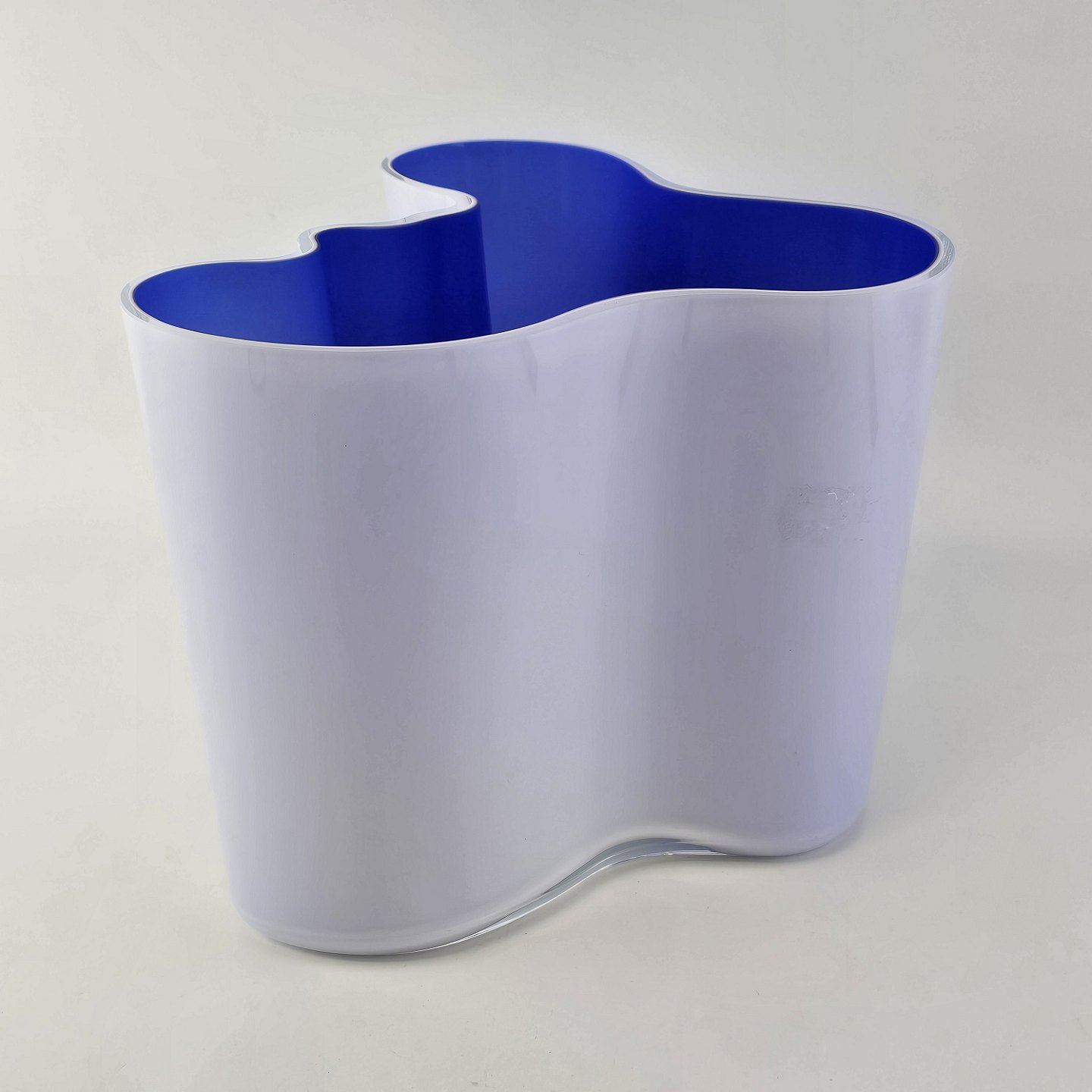 Beskrivelse: Savoy vase af glas, som er hvid på ydersiden og blå på indersiden