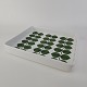 Stel i hvidt porcelæn med dekoration af grønne blade.