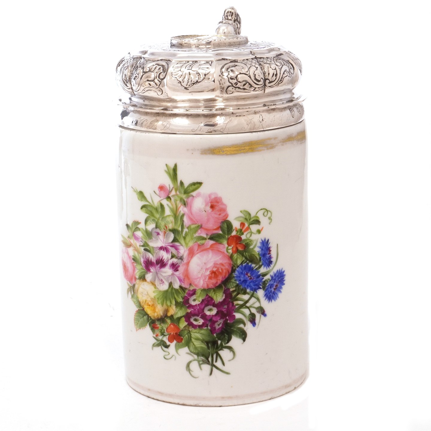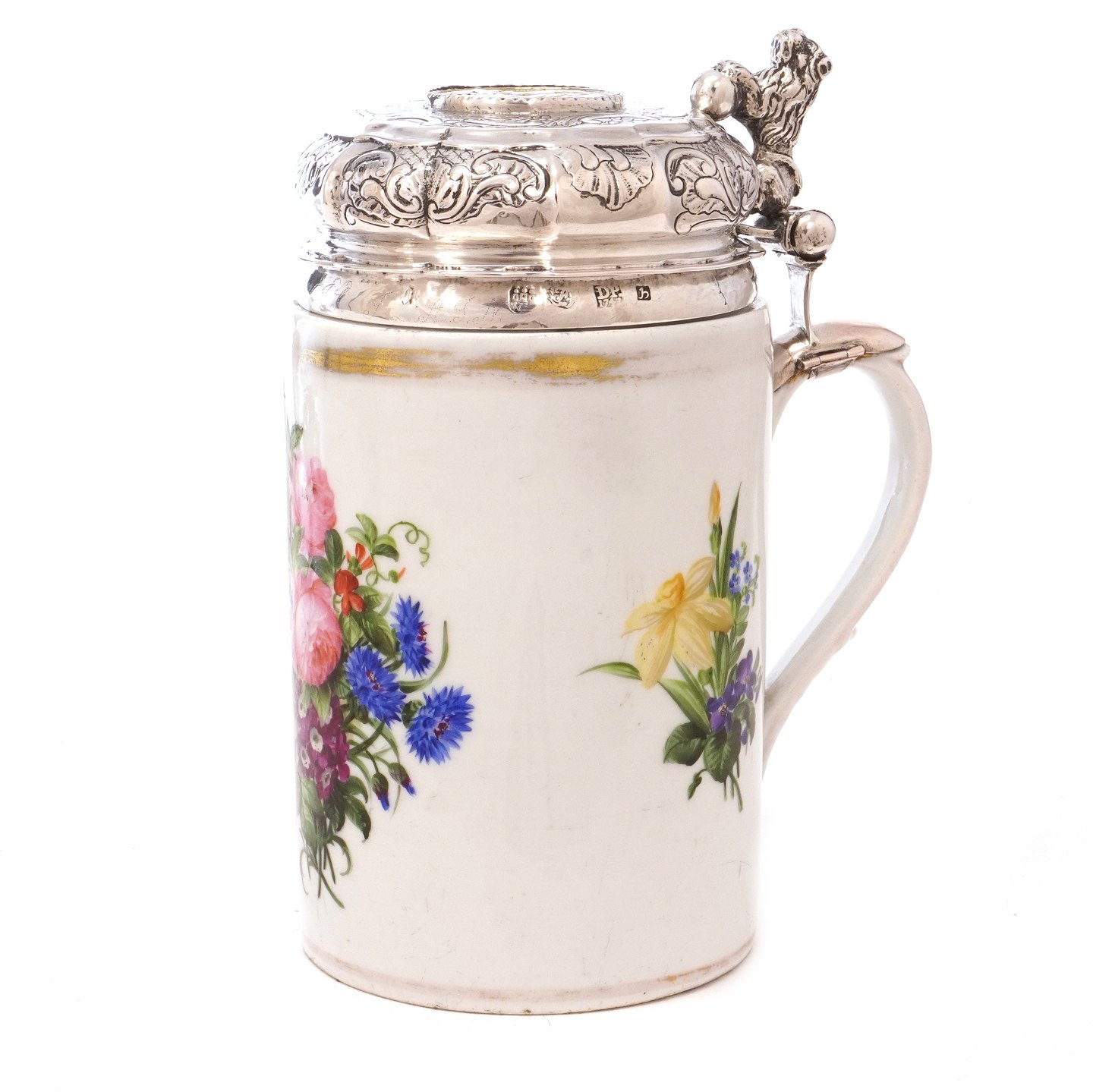 Tidligt Royal Copenhagen porcelænskrus med sølvlåg af Detlef Pape, København, af 1750erne. H: 21cm