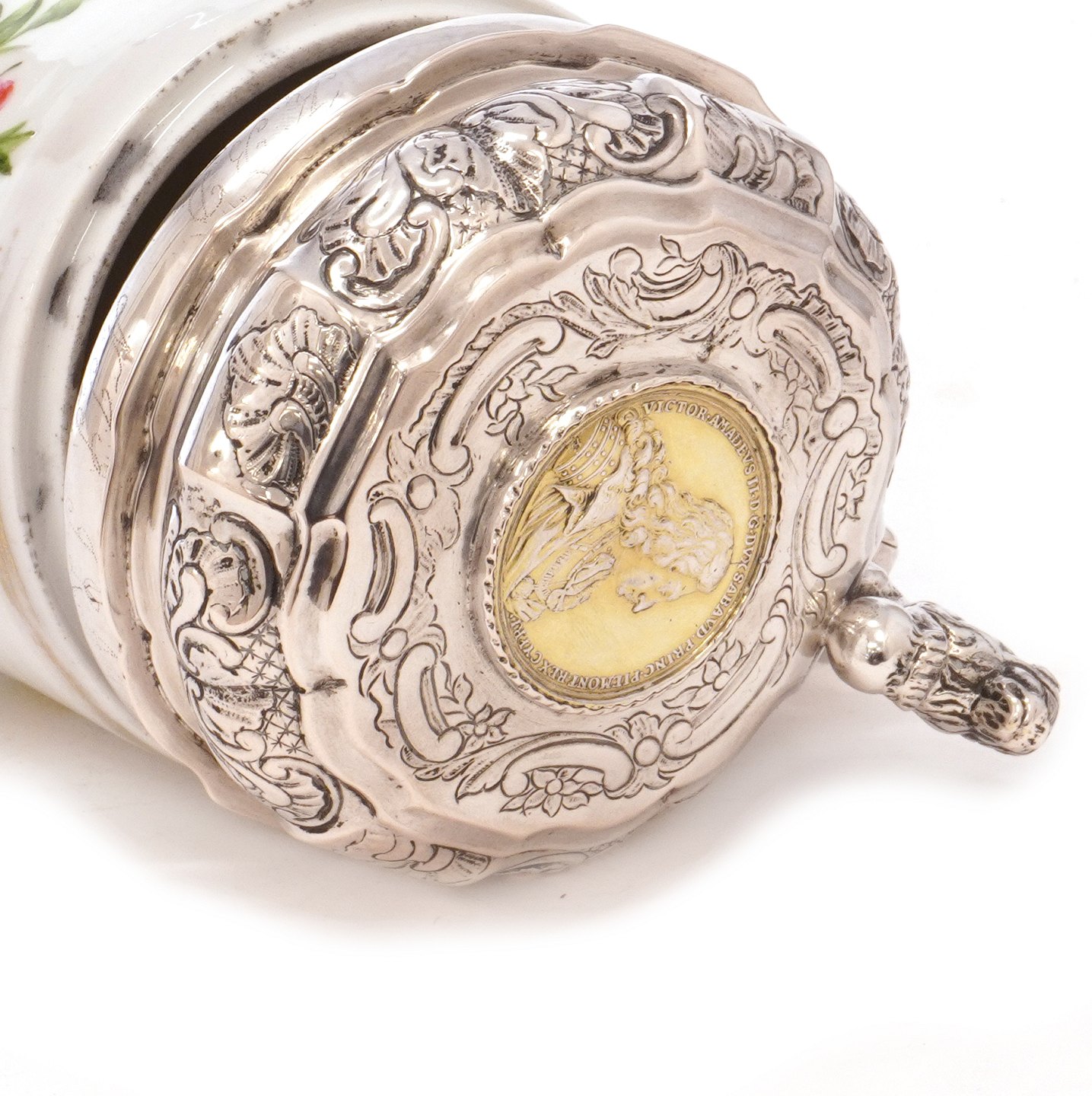 Beskrivelse: Tidligt Royal Copenhagen porcelænskrus med sølvlåg af Detlef Pape, København, af 1750erne