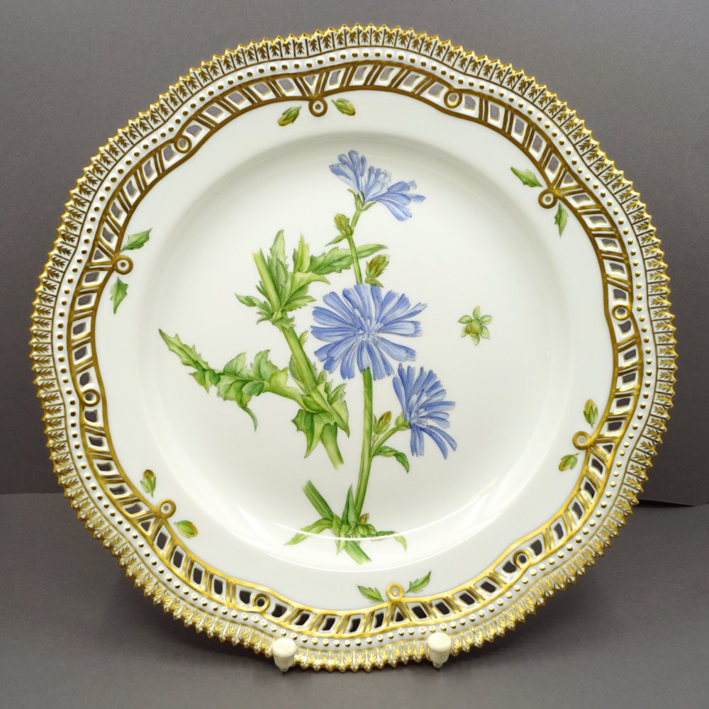 Beskrivelse: Royal Copenhagen, Flora Danica porcelæn; Middagstallerken #3553/3535 med gennembrudt kant.