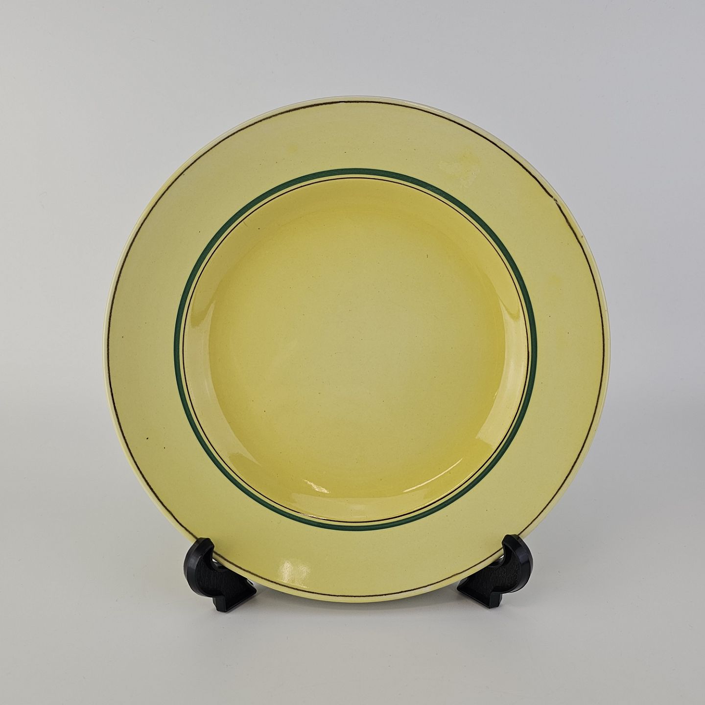 Fajancestel i stelform C med dekoration i gule nuancer med grøn stribe.