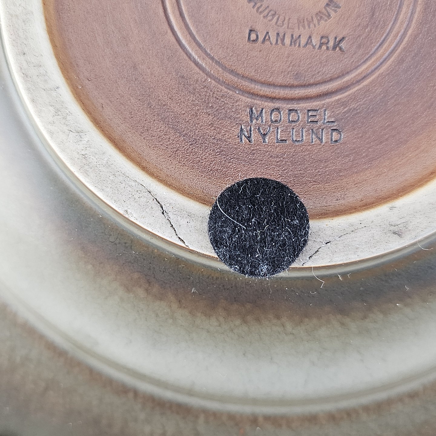 Beskrivelse: Rundt fad i stentøj med brun glasur. Nr. 2738, Model Nylund