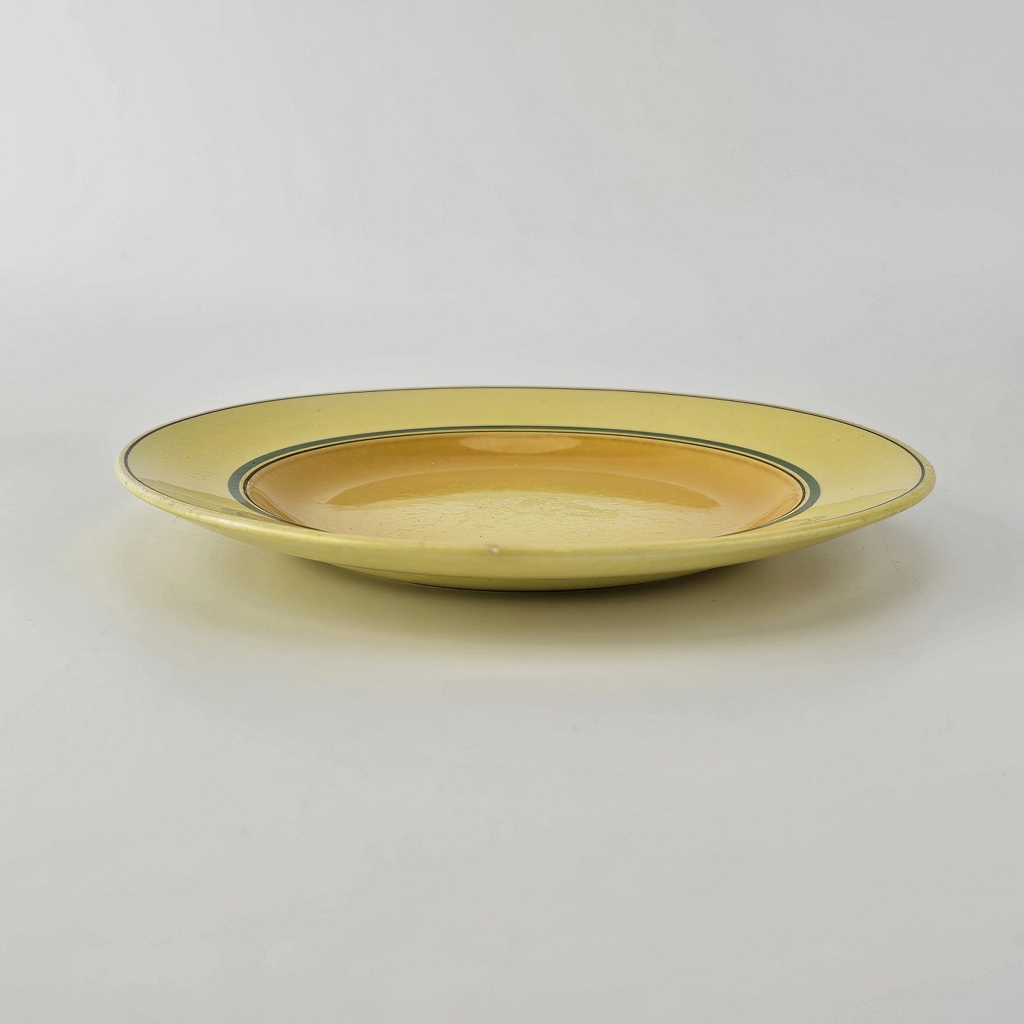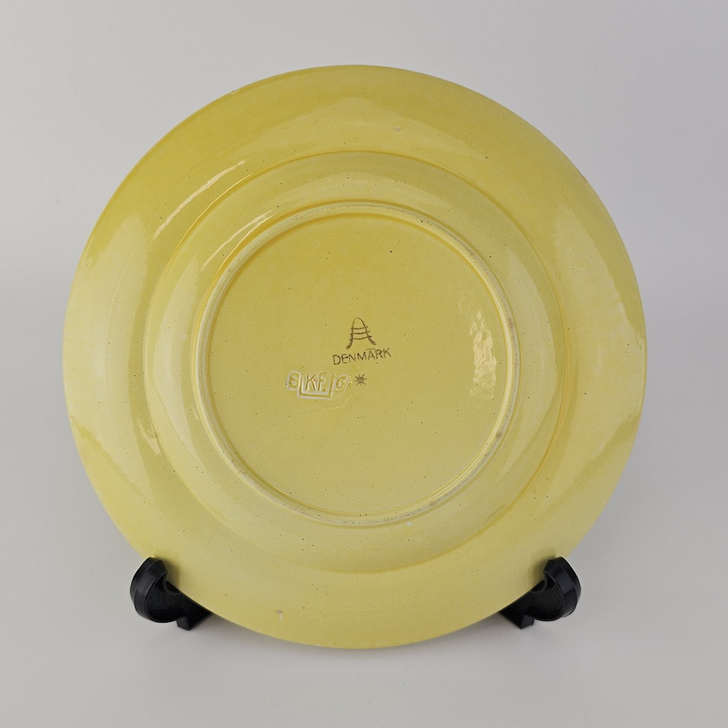 Fajancestel i stelform C med dekoration i gule nuancer med grøn stribe.