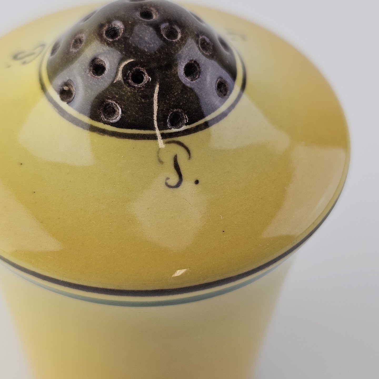 Beskrivelse: Peberbøsse i fajance fra stellet Gertrud fremstillet i perioden 1933-1939.