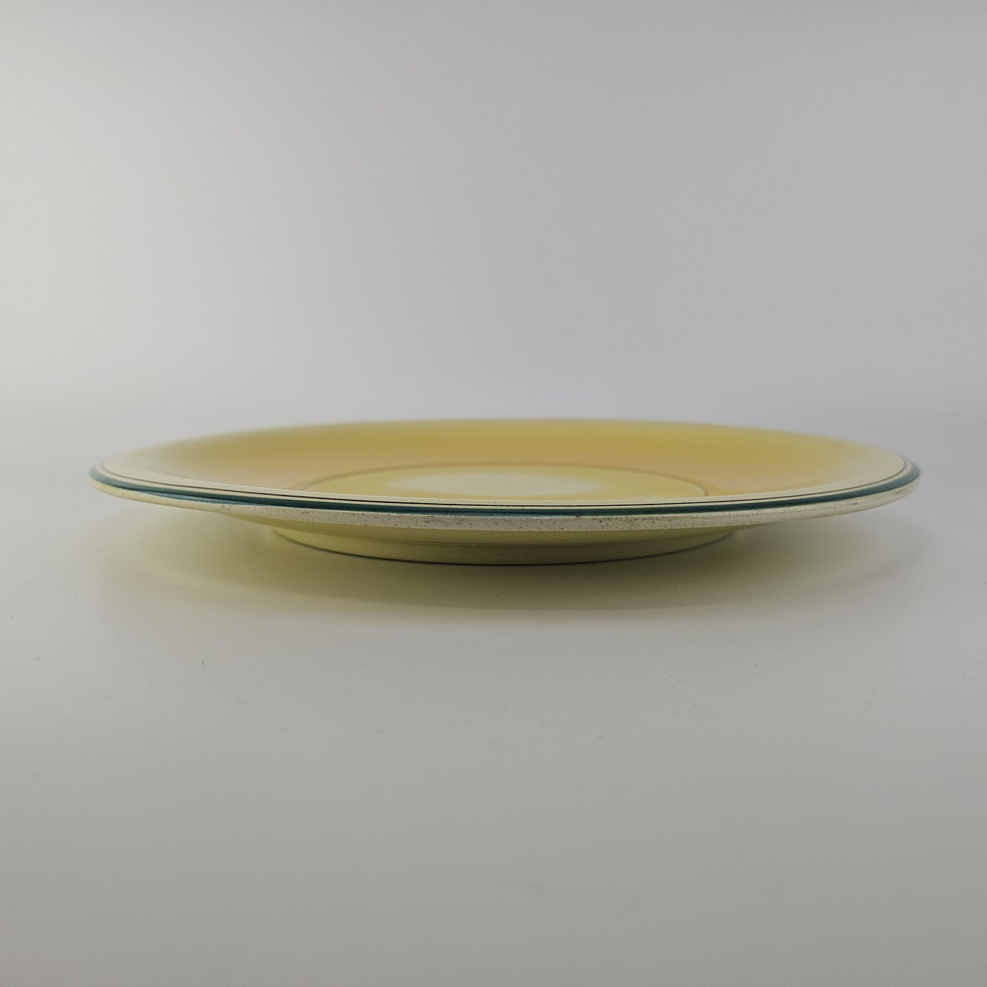 Fajancestel i stelform C med dekoration i gule nuancer med grøn stribe.