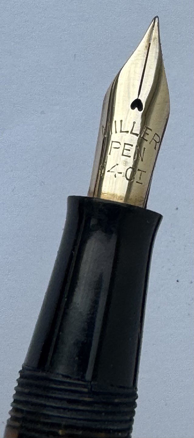 Beskrivelse: REN ART DECO STIL: 10 kantet og grøn marmoreret Miller nr. 697 fyldepen fra omkring 1940. I god stand uden skader eller reparationer. Alle dele originale til denne model inklusive en 14 karats guldspids (ca. 0,30 gram). Ny gummisæk skal indsættes før den igen kan optage blæk og skrive påny. Ny gummisæk kan indsættes for et tillæg på kr. 250,00. Fyldepennen er 12,3 cm lang.