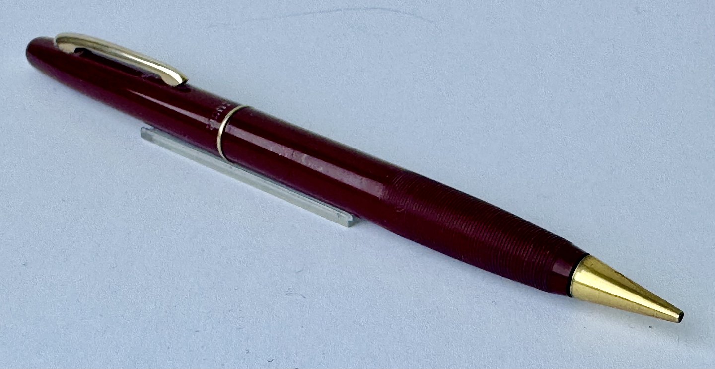 Beskrivelse: Slank Bordeaux Montblanc nr. 222 skrueblyant fra omkring 1960. Fremstår i virkelig god stand. bly-stiften kører frem tilbage når mekanismen aktiveres. 13,8 cm lang