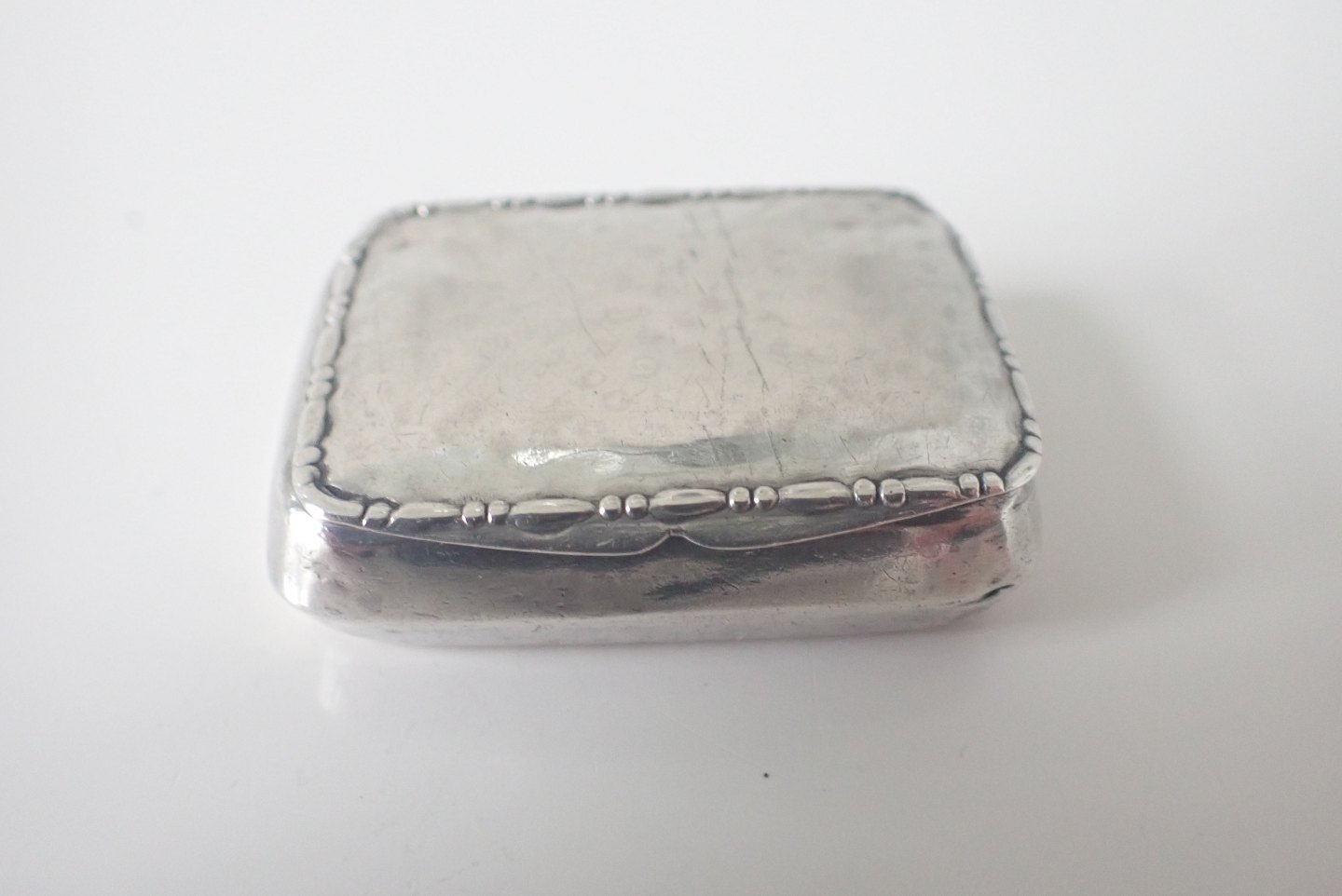 Beskrivelse: Æske bagerst: Firkantet pilleæske/tabatiere i tysk sølv med punslet dekorationer på forside, bagside og kanter. Tidlig 1800-tal. Vægt: 20,3 gram. Højde: 2,1 cm. bredde: 4,5 cm. I fin stand i forhold til alder. Pris: 600 kr.
