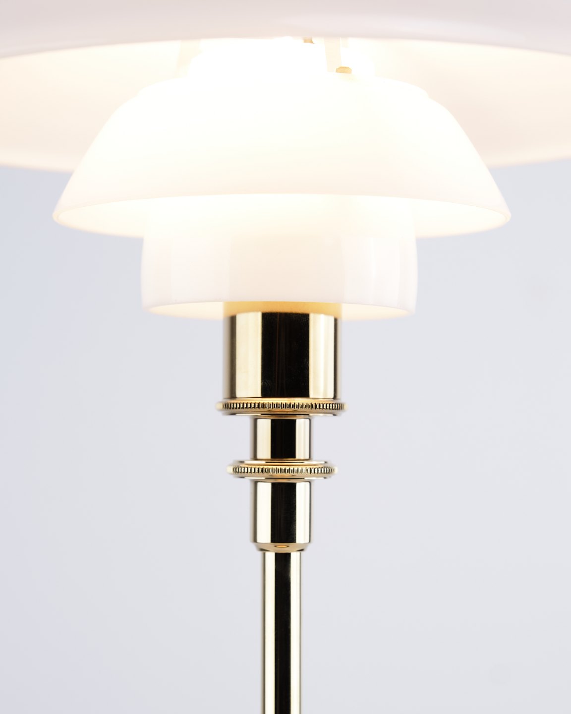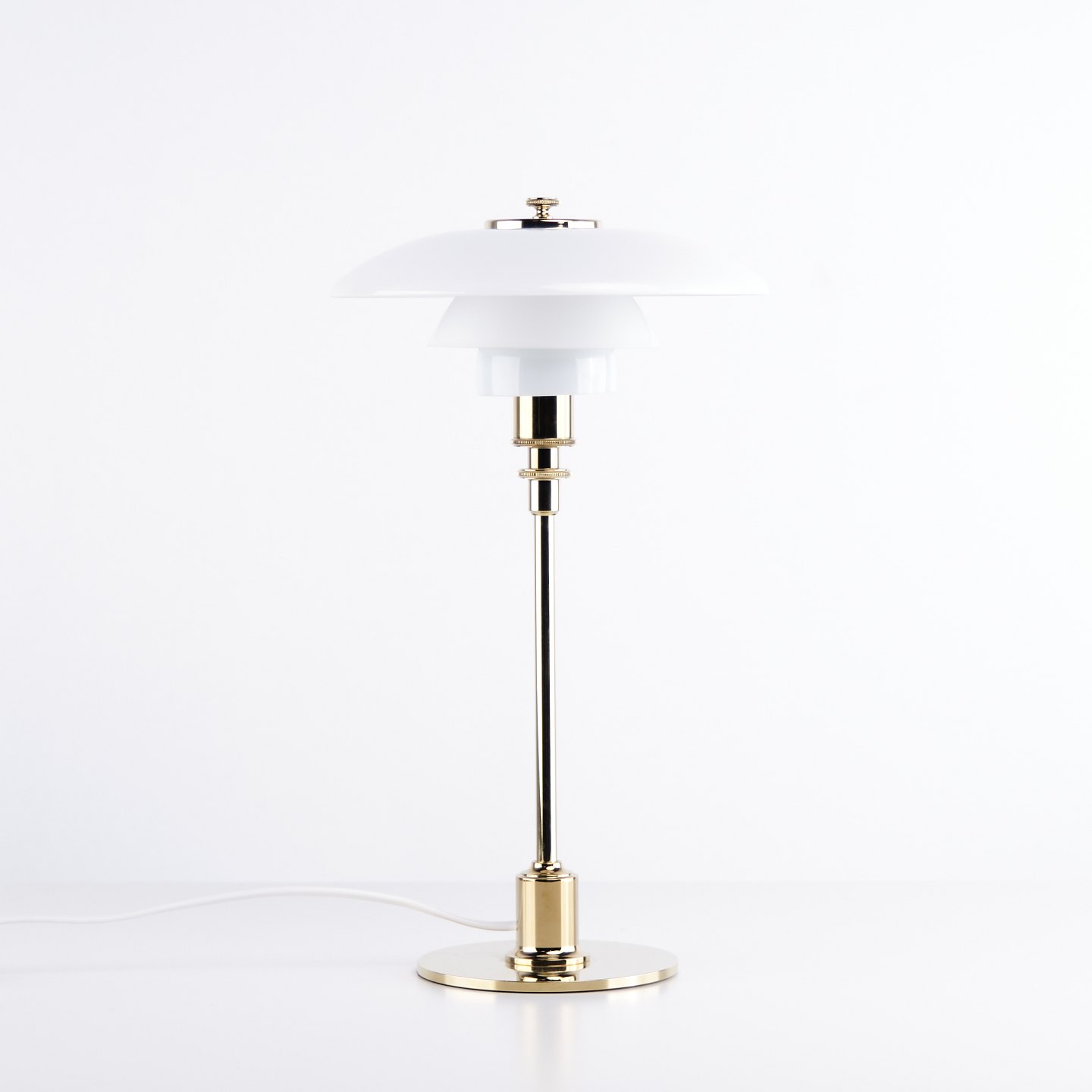 Beskrivelse: PH 2/1 bordlampe designet af Poul Henningsen og introduceret i denne version af Louis Poulsen i 2019. Lampen er udført med fod i messing og skærme i hvidt opalglas, som giver et blødt og behageligt lys. Det ikoniske treskærmssystem er udviklet til at sikre optimal lysfordeling og minimere blænding.